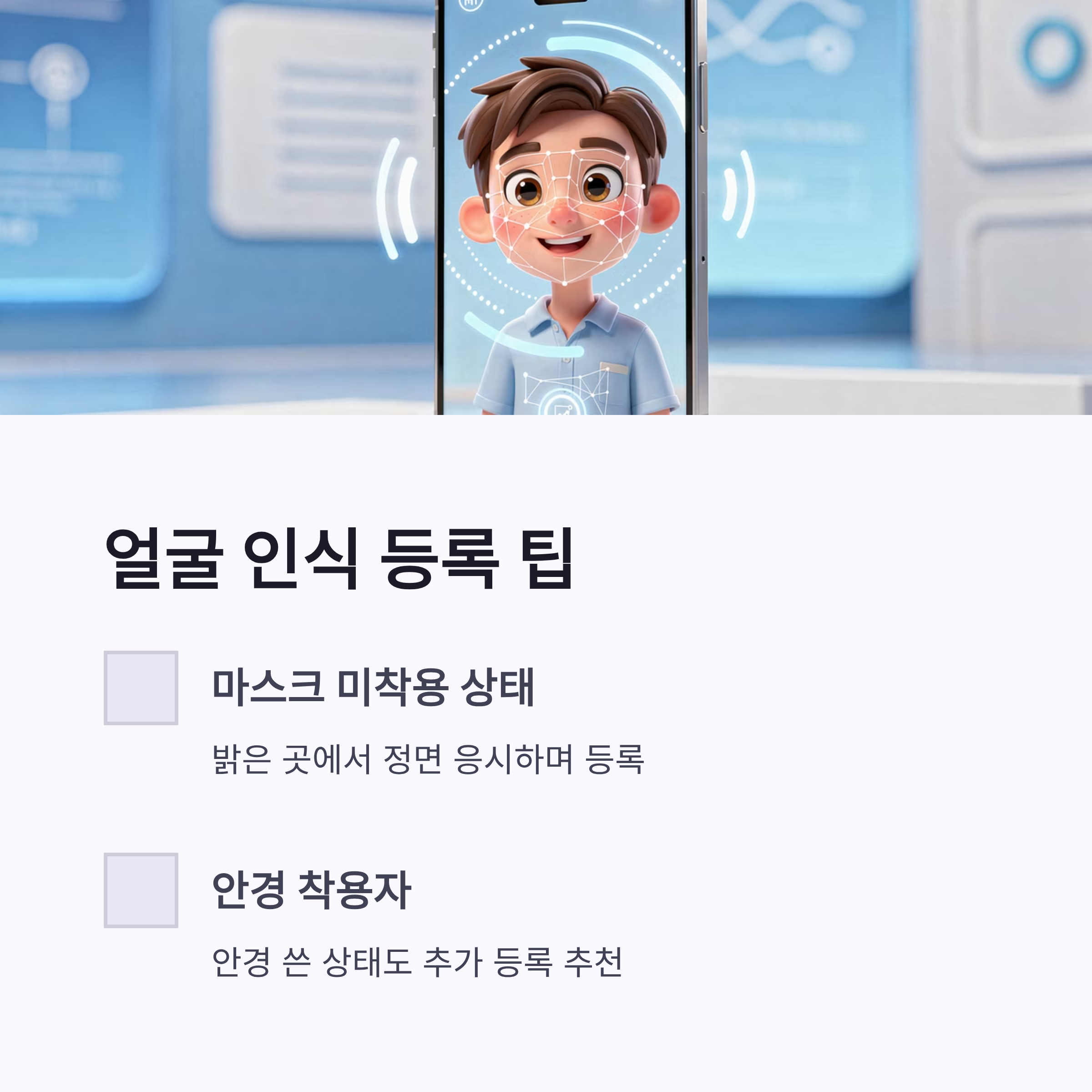 * 지문 등록 시 엄지 여러 각도로 꾹꾹 눌러주기 * 폴드 접은 상태 기준으로 주로 쓰는 손가락 위주 등록 * 얼굴 인식은 마스크 미착용 상태 + 밝은 곳에서 등록 * 안경 쓰는 분은 안경 착용 상태도 추가 등록 추천