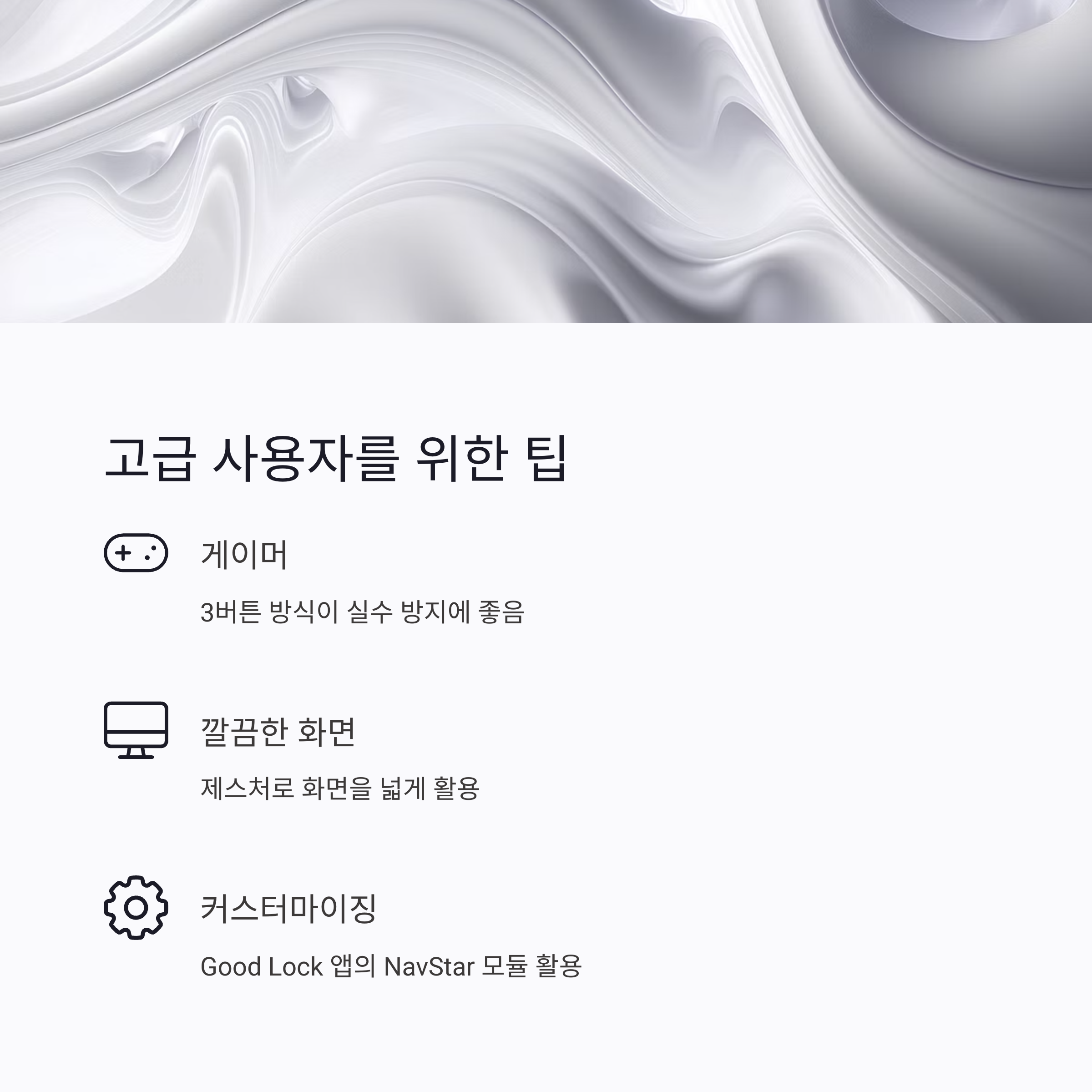 - 🔧 고급 설정 원하세요? → 'Galaxy Store'에서 ‘Good Lock’ 다운로드