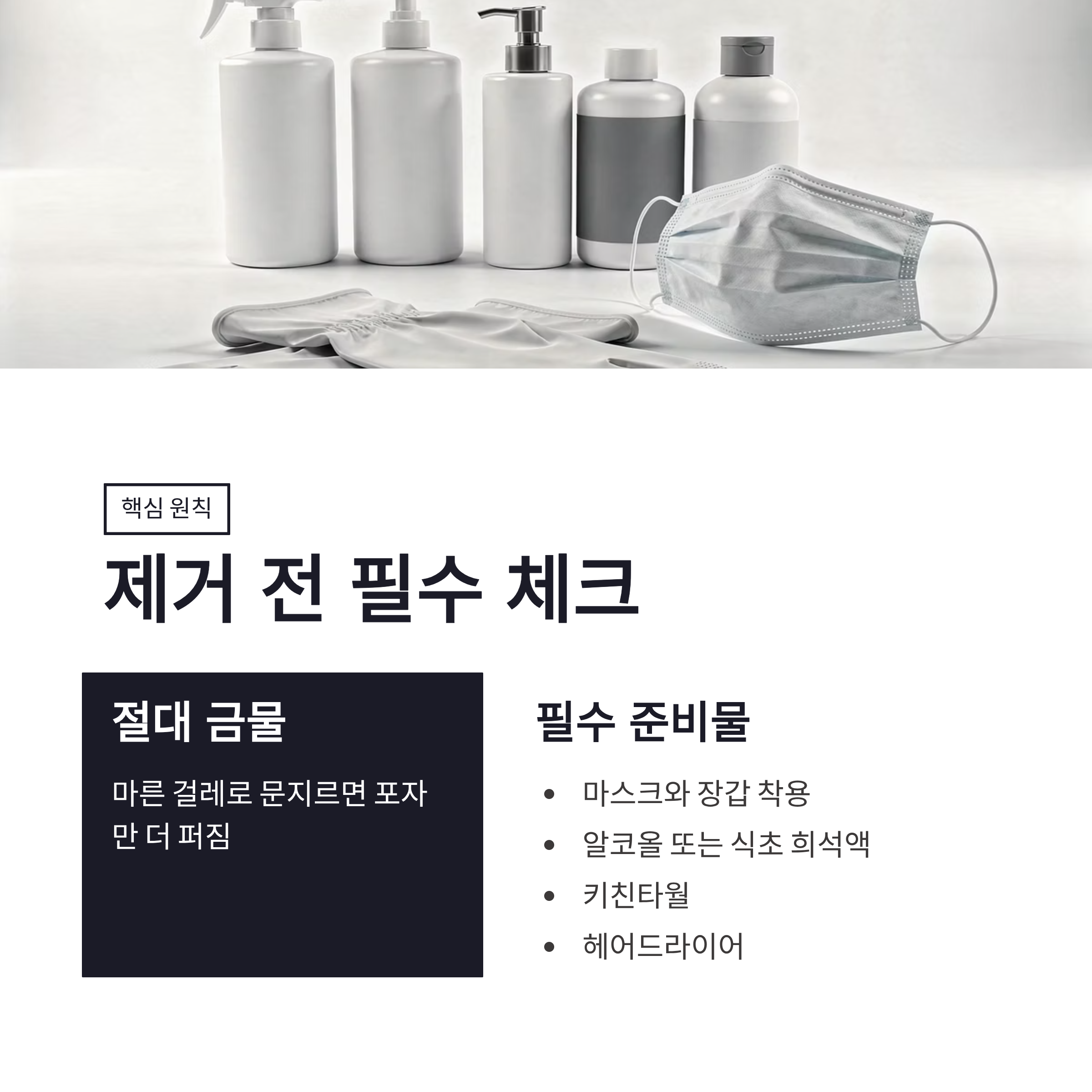 | 단계 | 방법 | 체감 포인트 | | -- | ---------------- | ------------------- | | 1 | 알코올 또는 식초 희석액 분사 | 곰팡이 번짐 최소화 | | 2 | 키친타월로 톡톡 눌러 흡수 | 문지르지 않는 게 핵심 | | 3 | 완전 건조 | 헤어드라이어 약풍 추천 | | 4 | 곰팡이 제거제 국소 사용 | 벽지 곰팡이 제거 효과 확실 |