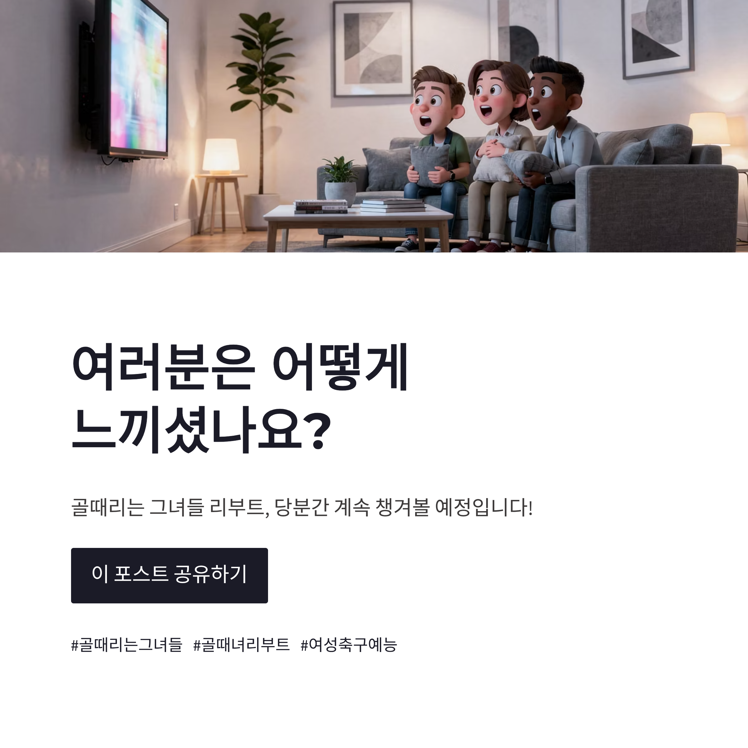 결론적으로 골때리는 그녀들 리부트는 “다시 축구 예능답게 돌아왔다”는 인상이 강했습니다. 가볍게 틀어놓는 예능보다는, 챙겨보게 되는 프로그램이 된 느낌이랄까 ㅎㅎ 앞으로 팀 간 경쟁 구도만 더 살아나면 몰입도는 더 올라갈 것 같아요. 골때리는 그녀들 리부트, 저는 당분간 계속 챙겨볼 예정인데요. 여러분은 이번 변화, 어떻게 느끼셨나요?
