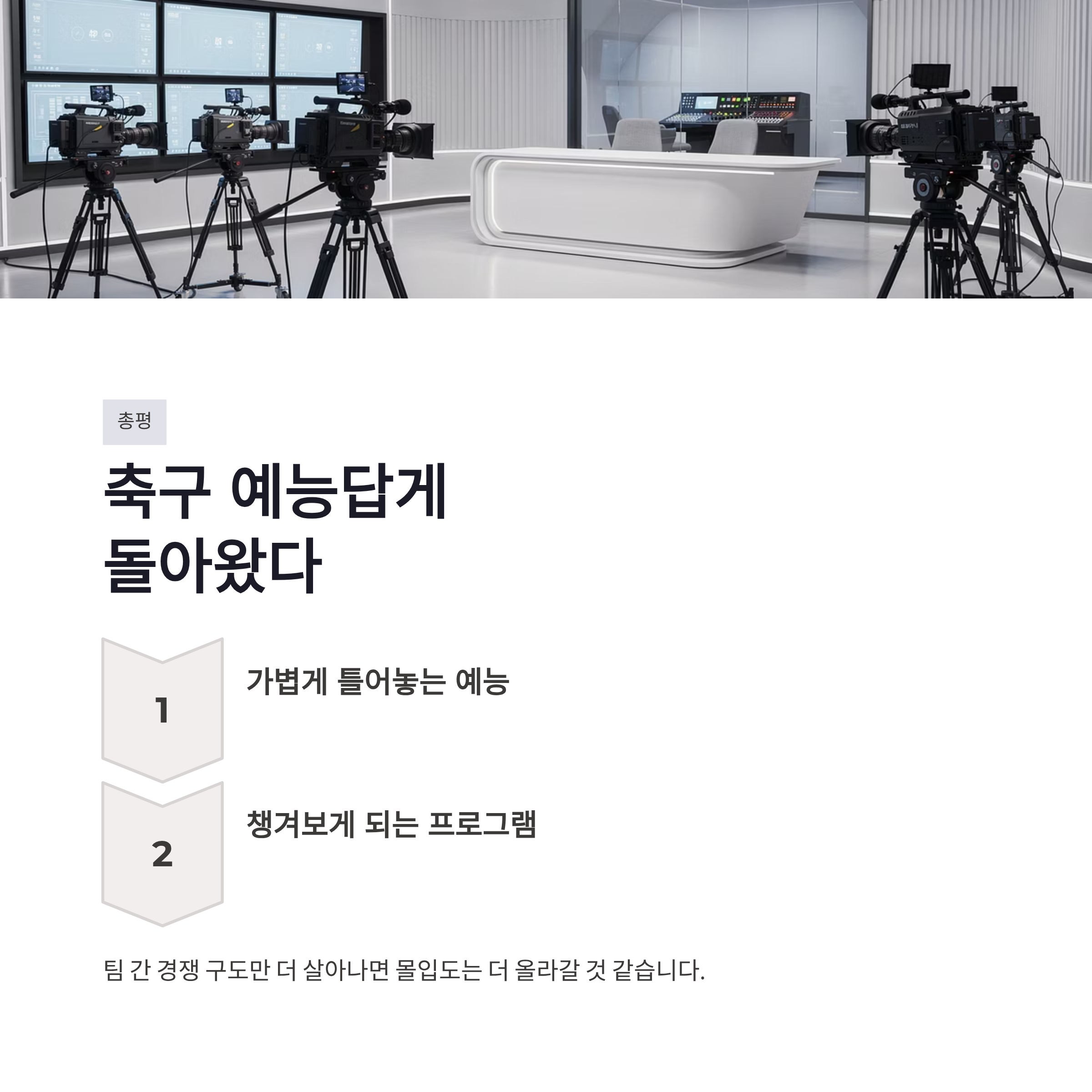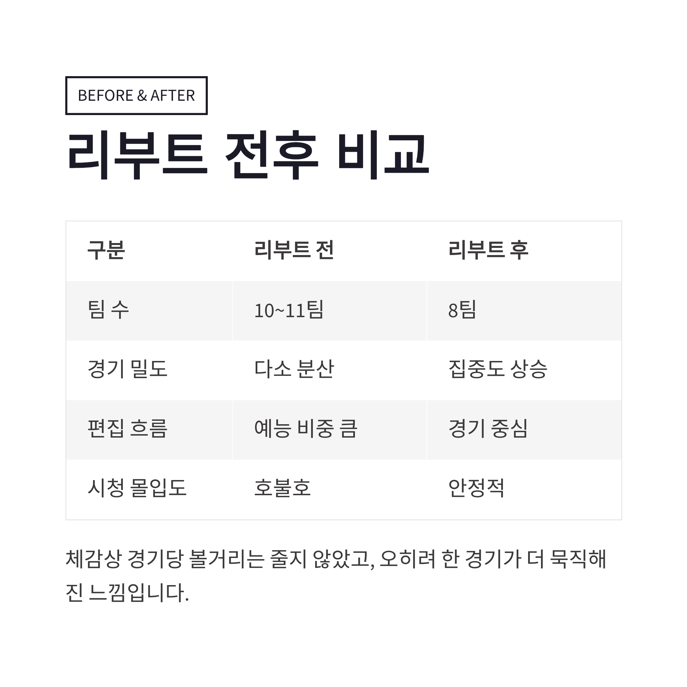 | 편집 흐름 | 예능 비중 큼 | 경기 중심 |