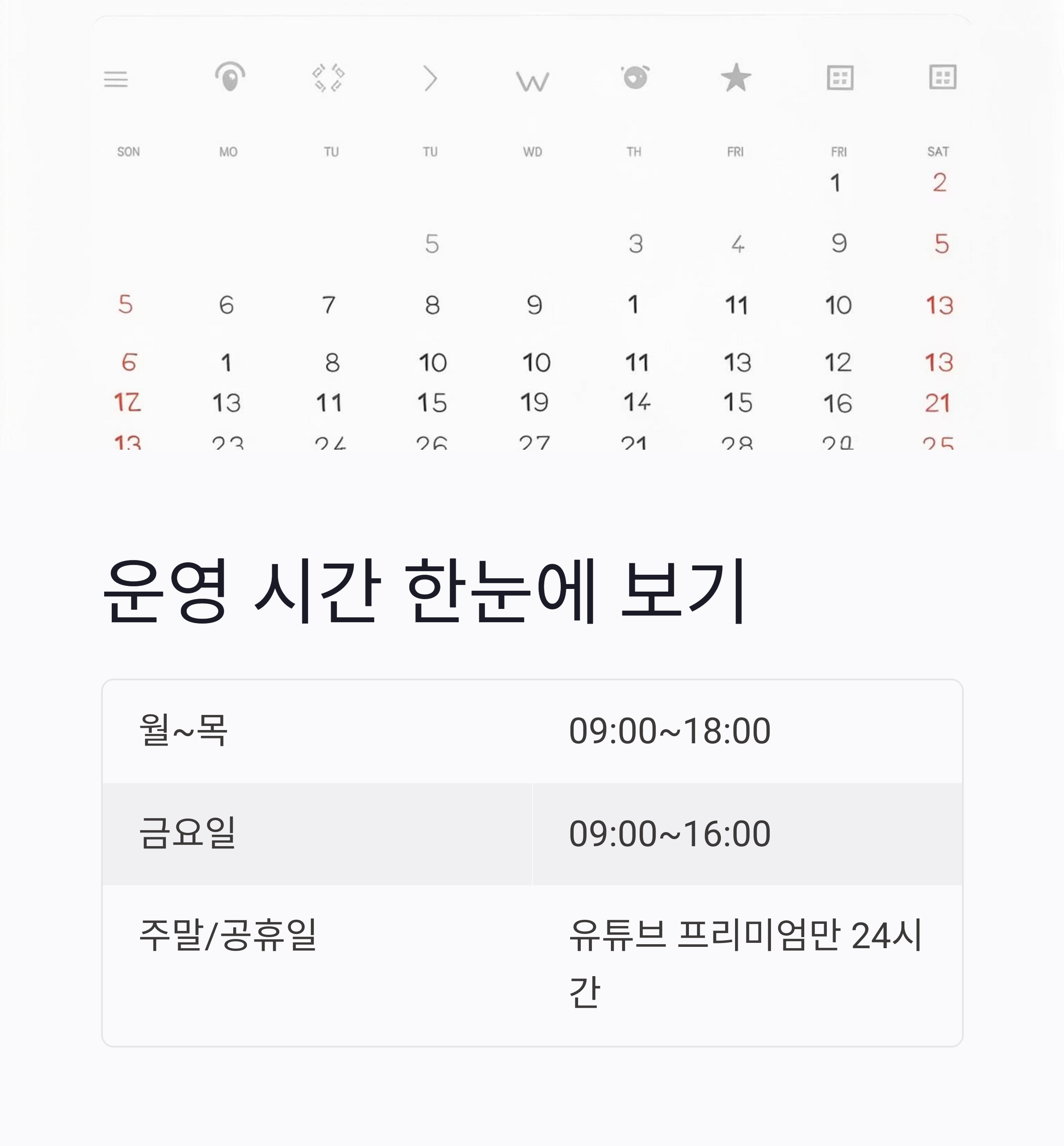 | 주말/공휴일 | 운영 안 함 | 유튜브 프리미엄만 24시간 운영 |