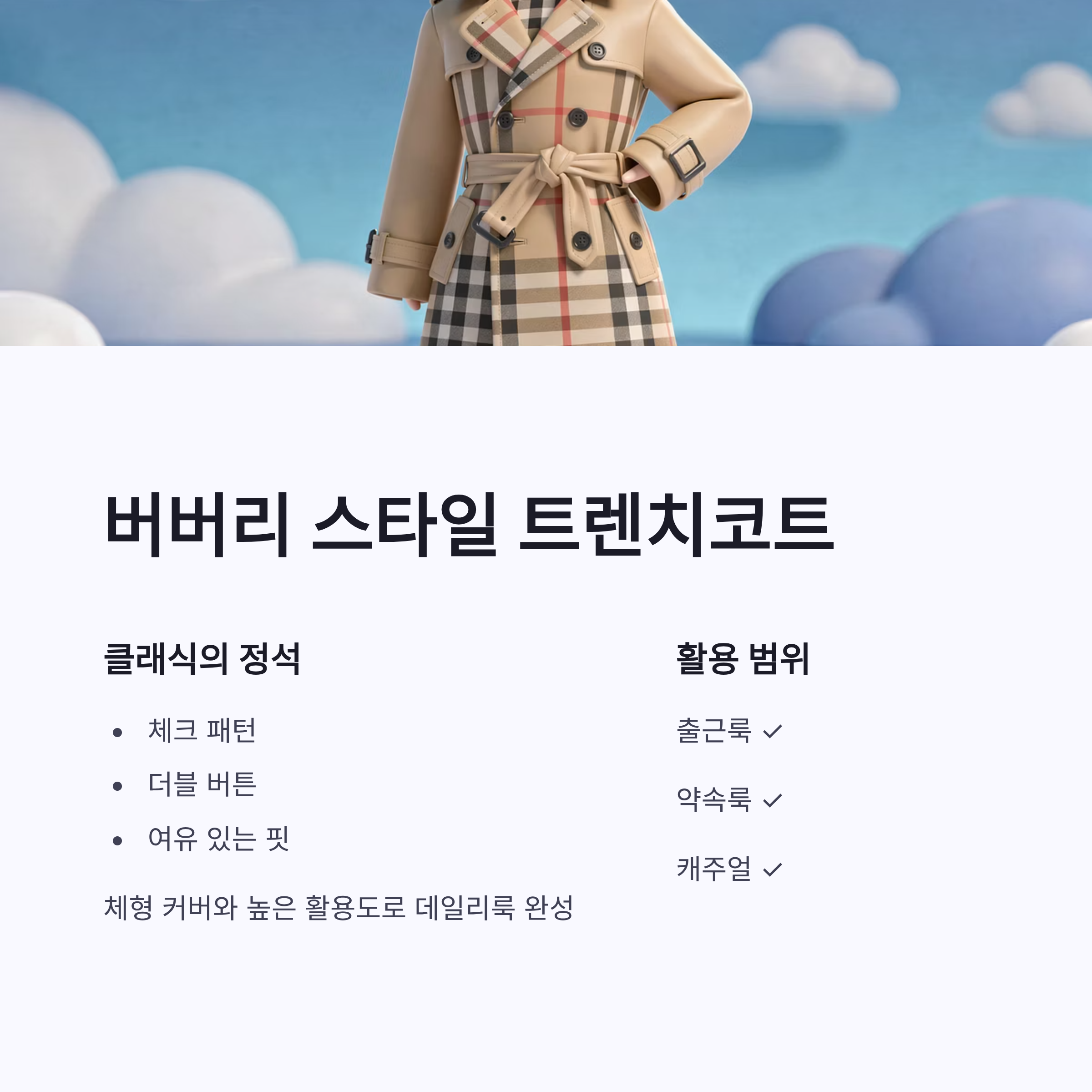 | 트렌치코트 | 클래식 체크 | 데일리 활용 |