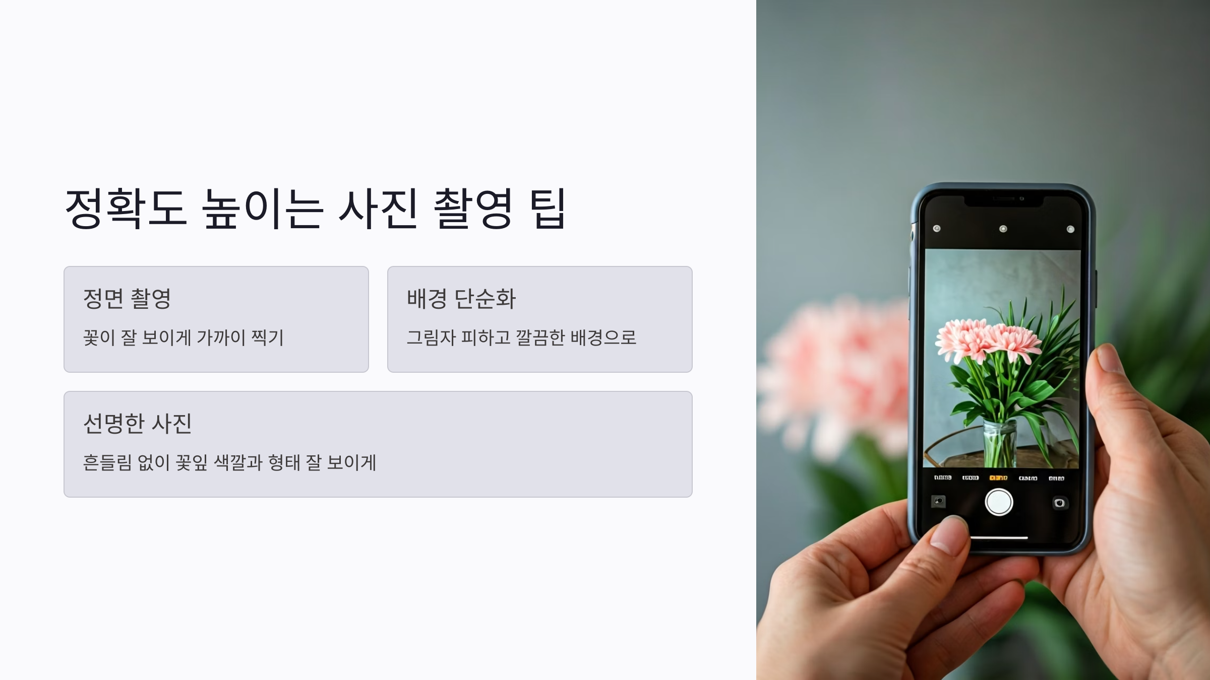 특히 꽃잎 색깔이나 형태 잘 보이게 찍는 게 핵심!