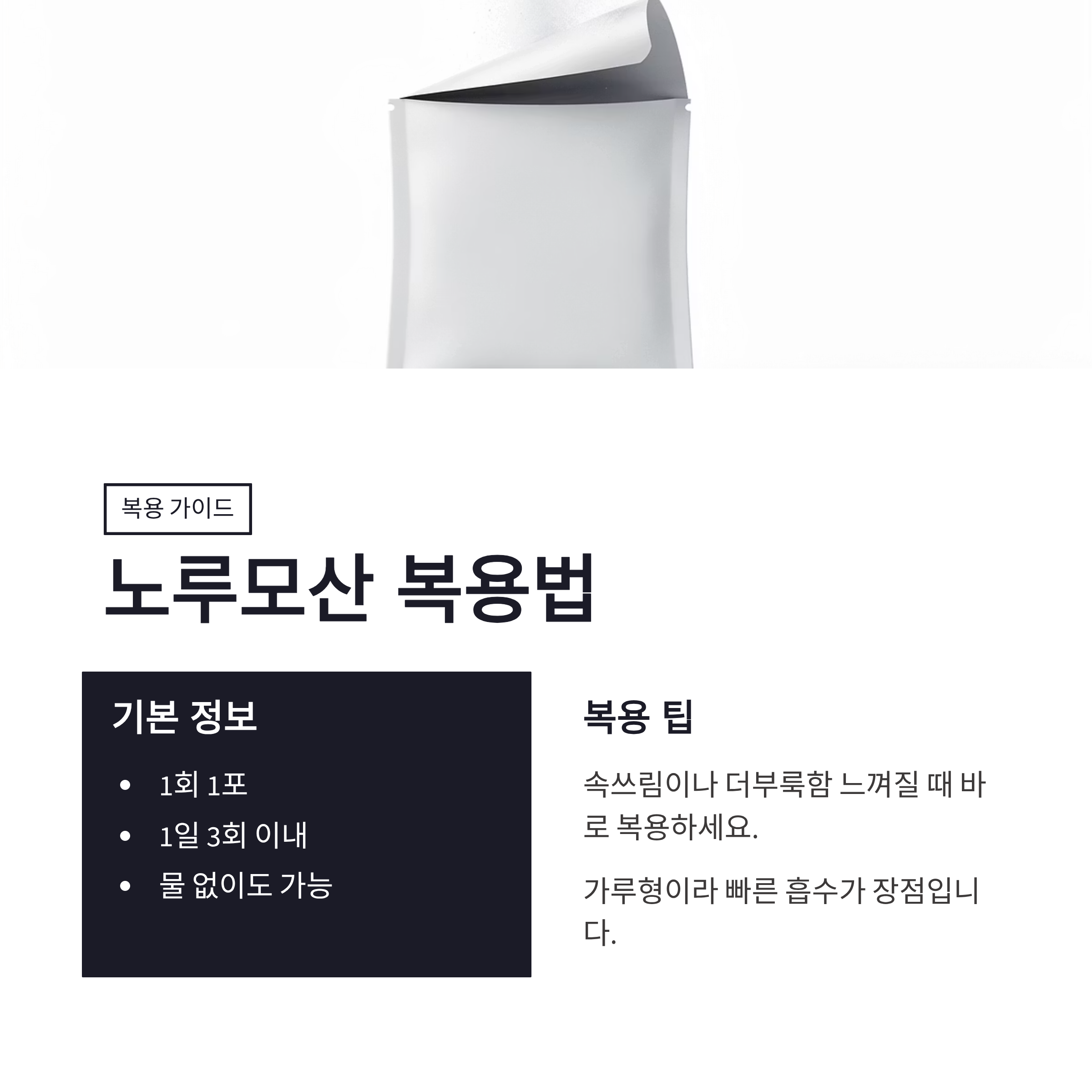 노루모산은 가루형 위장약이라서 복용법도 단순한 편입니다. 물 없이 바로 먹어도 되고, 물이랑 같이 먹어도 상관없어요. 저는 개인적으로 물 없이 먹는 게 더 빨리 듣는 느낌이었는데요, 이건 완전 개인차겠쥬.