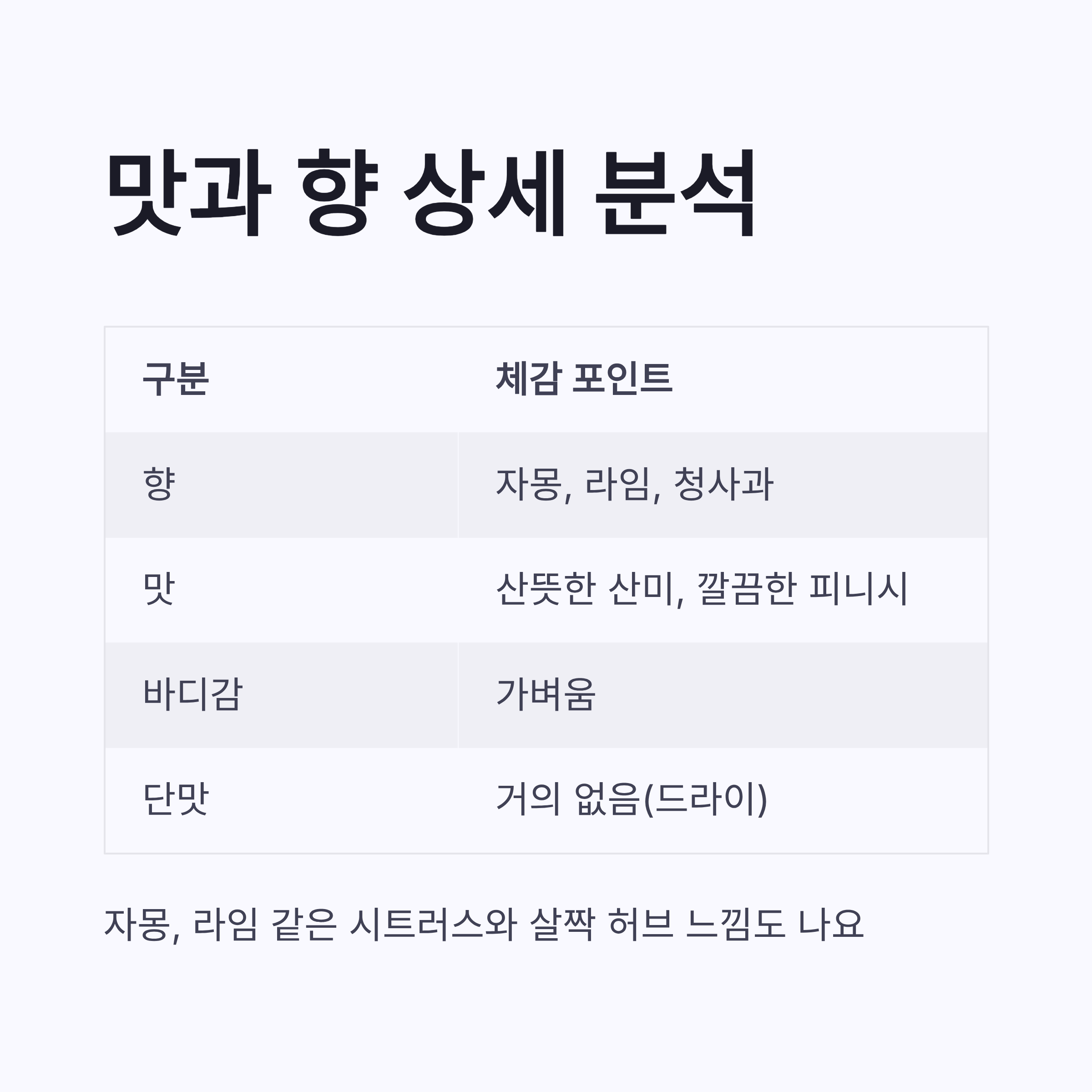 | 단맛 | 거의 없음(드라이) |