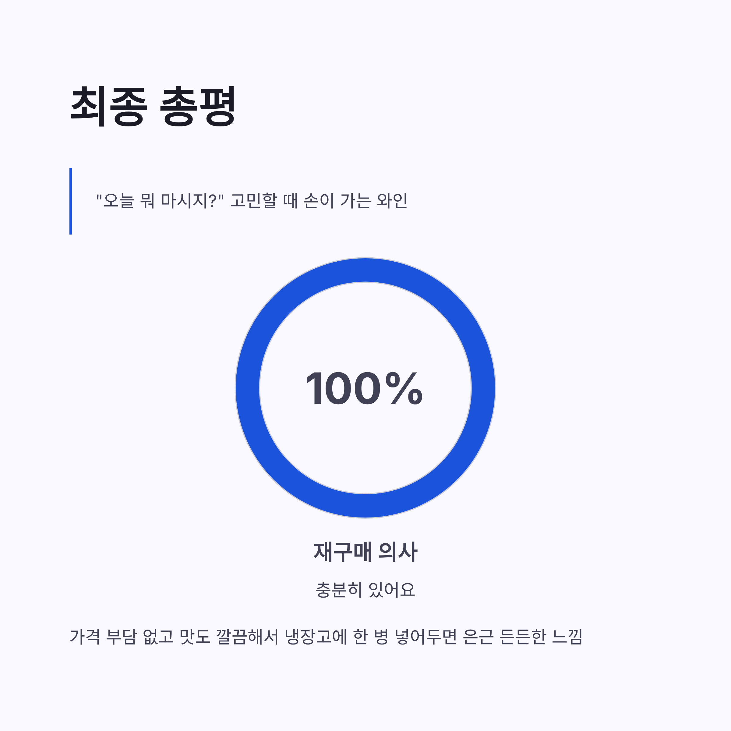 결론적으로 러시안잭 소비뇽블랑은 “오늘 뭐 마시지?” 고민할 때 손이 가는 와인이었어요. 가격 부담 없고, 맛도 깔끔해서 재구매 의사 충분합니다. 와인 초보, 화이트와인 좋아하는 분, 상큼한 데일리 와인 찾는 분이라면 한 번쯤은 꼭 마셔봐도 좋겠더라구요. 냉장고에 한 병 넣어두면 은근 든든한 느낌… 저만 그런가요? ㅎㅎ