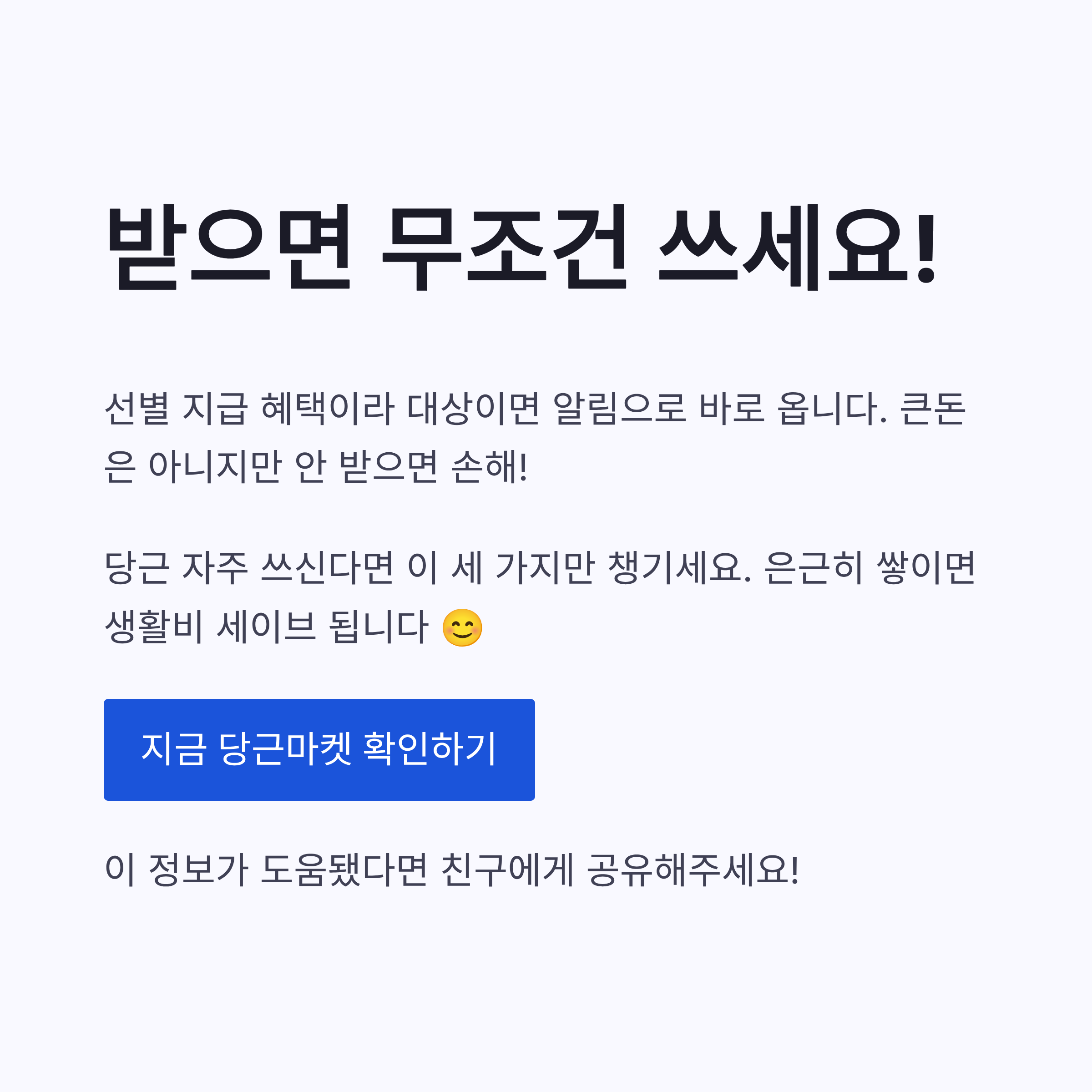 정리하면 당근마켓 방어 지원금 5천원은 신청형 이벤트라기보단 선별 지급 혜택에 가까워요. 내가 대상이면 알림으로 바로 오고, 앱 안에서 클릭 한 번이면 끝. 큰돈은 아니지만, 안 받으면 손해인 건 맞쥬? ㅎㅎ 당근 자주 쓰신다면 당근페이 설정, 앱 업데이트, 알림 허용 이 세 가지만은 꼭 챙겨두세요. 은근히 이런 게 쌓이면 생활비 세이브 됩니다. 저만 그런가요?