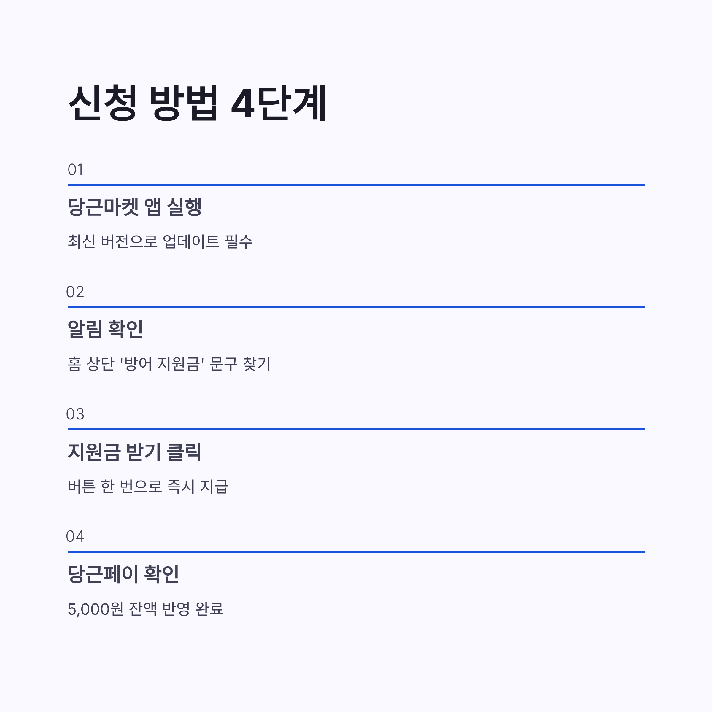 | 단계 | 진행 내용 | 체크 포인트 | | -- | ------------- | ----------- | | 1 | 당근마켓 앱 실행 | 최신 버전 필수 | | 2 | 홈 상단 또는 알림 확인 | ‘방어 지원금’ 문구 | | 3 | 지원금 받기 버튼 클릭 | 즉시 지급 | | 4 | 당근페이 잔액 확인 | 5,000원 반영 |
