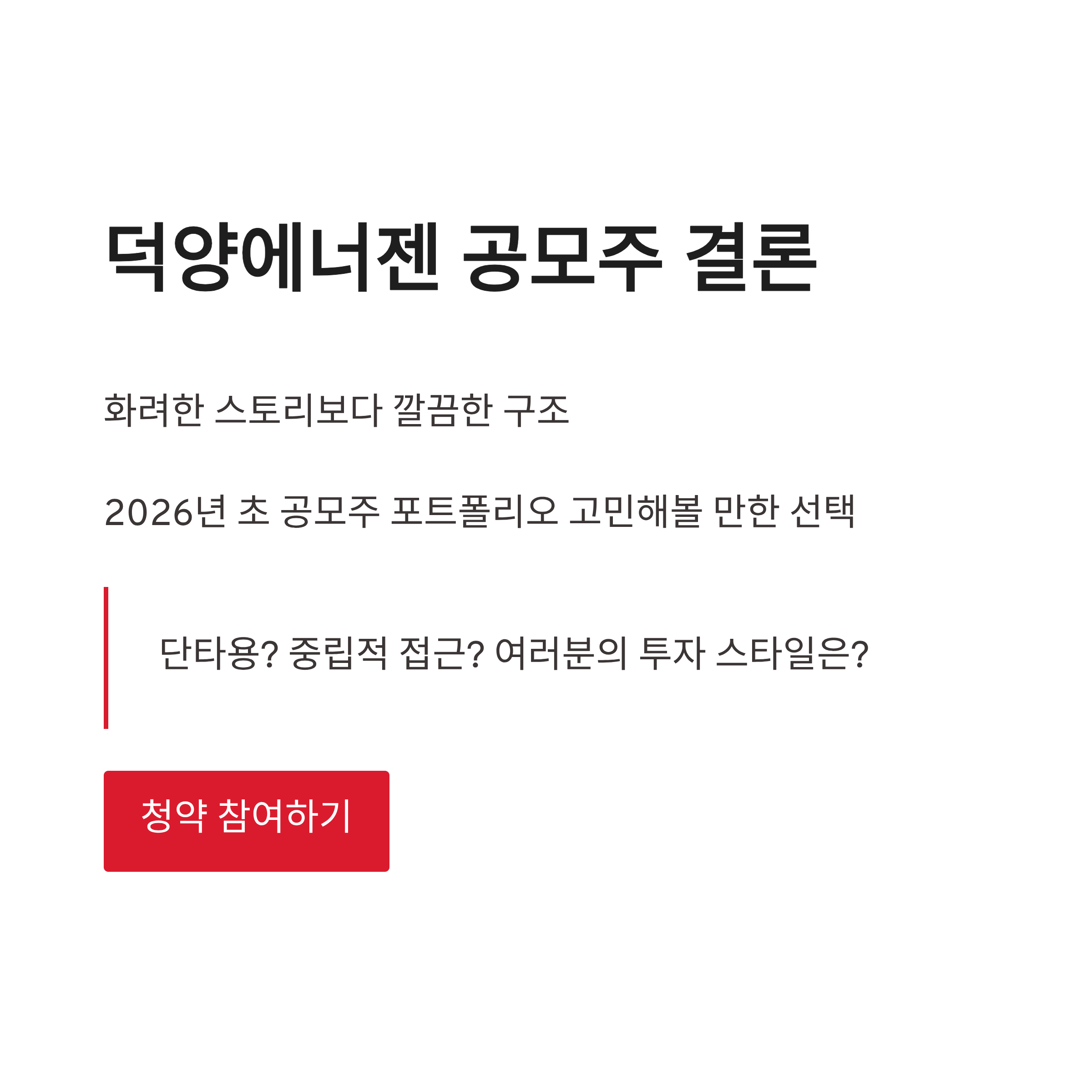 정리해보면 덕양에너젠 공모주는 화려한 스토리보단 구조가 깔끔한 타입입니다. 공모가도 부담 없는 편이고, 수소 테마 안에서도 산업용이라는 점이 차별화 포인트예요. 저는 개인적으로 “무조건 대박” 이런 느낌까진 아니지만, 덕양에너젠 공모주를 2026년 초 공모주 포트폴리오 한 칸 정도로는 충분히 고민해볼 만하다고 봤어요. 여러분은 단타용으로 보시나요, 아니면 중립적으로 접근하시나요? 생각 좀 갈릴 듯하네요 ㅎㅎ