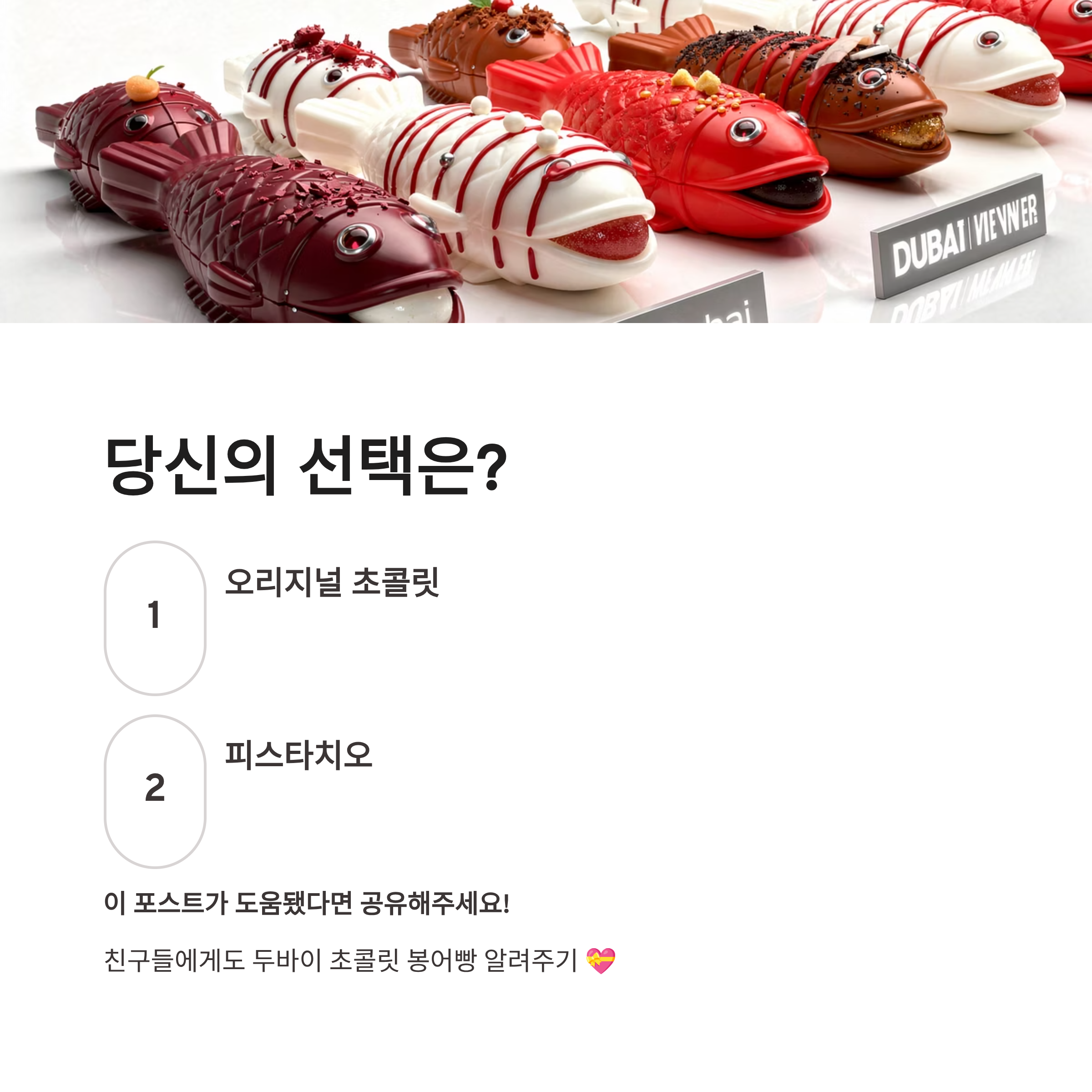 정리해보면 두바이 초콜릿 봉어빵은 가격대는 있지만, 겨울 시즌 한정 간식으로는 충분히 재미있는 선택이었어요. 어디서 사느냐에 따라 맛도 꽤 다르고, 선물용으로도 은근 반응 좋더라구요 ㅎㅎ 지나가다 보이면 하나쯤 집어 들어도 후회는 없을 듯합니다. 여러분은 오리지널이 좋으세요, 아니면 피스타치오 쪽이 끌리시나요?