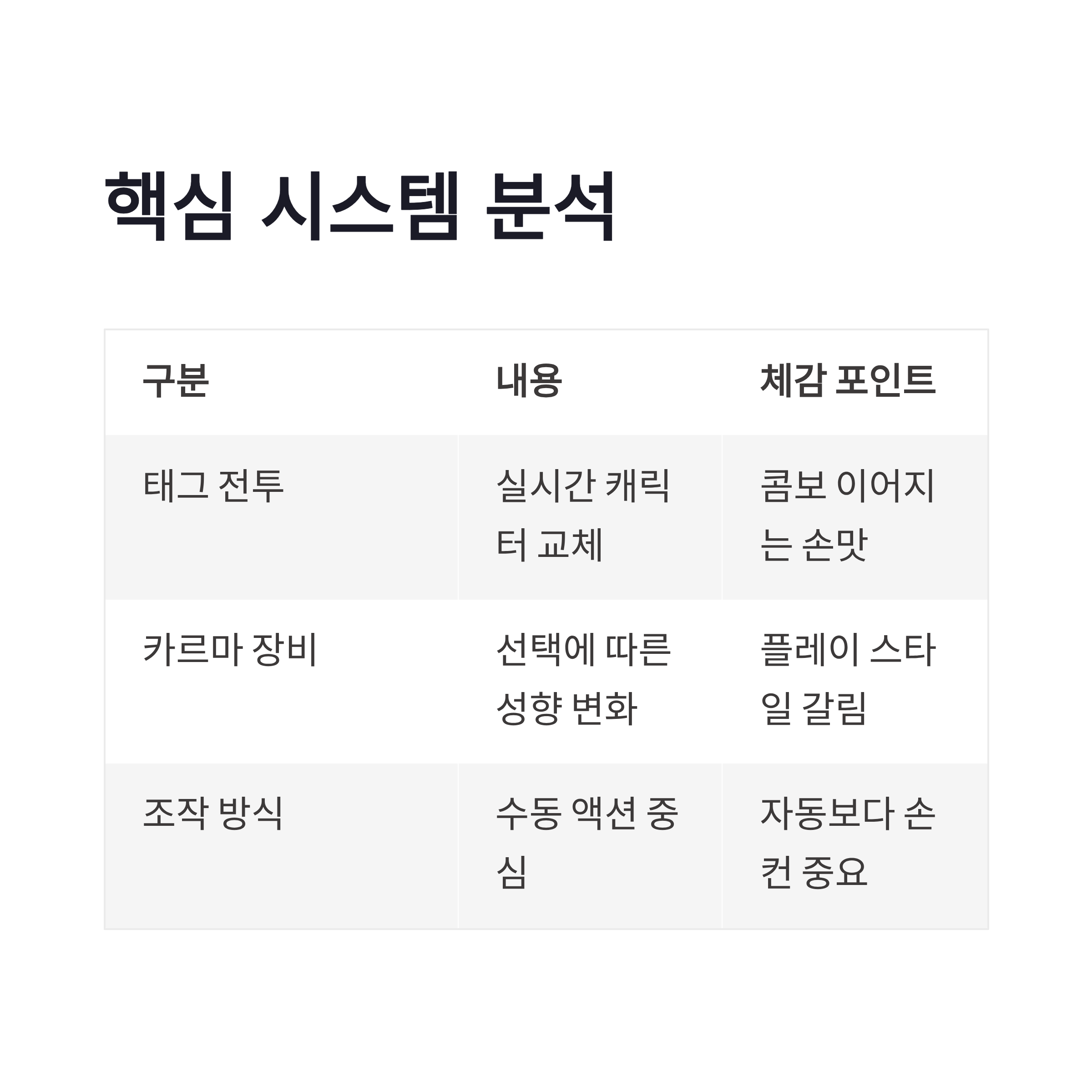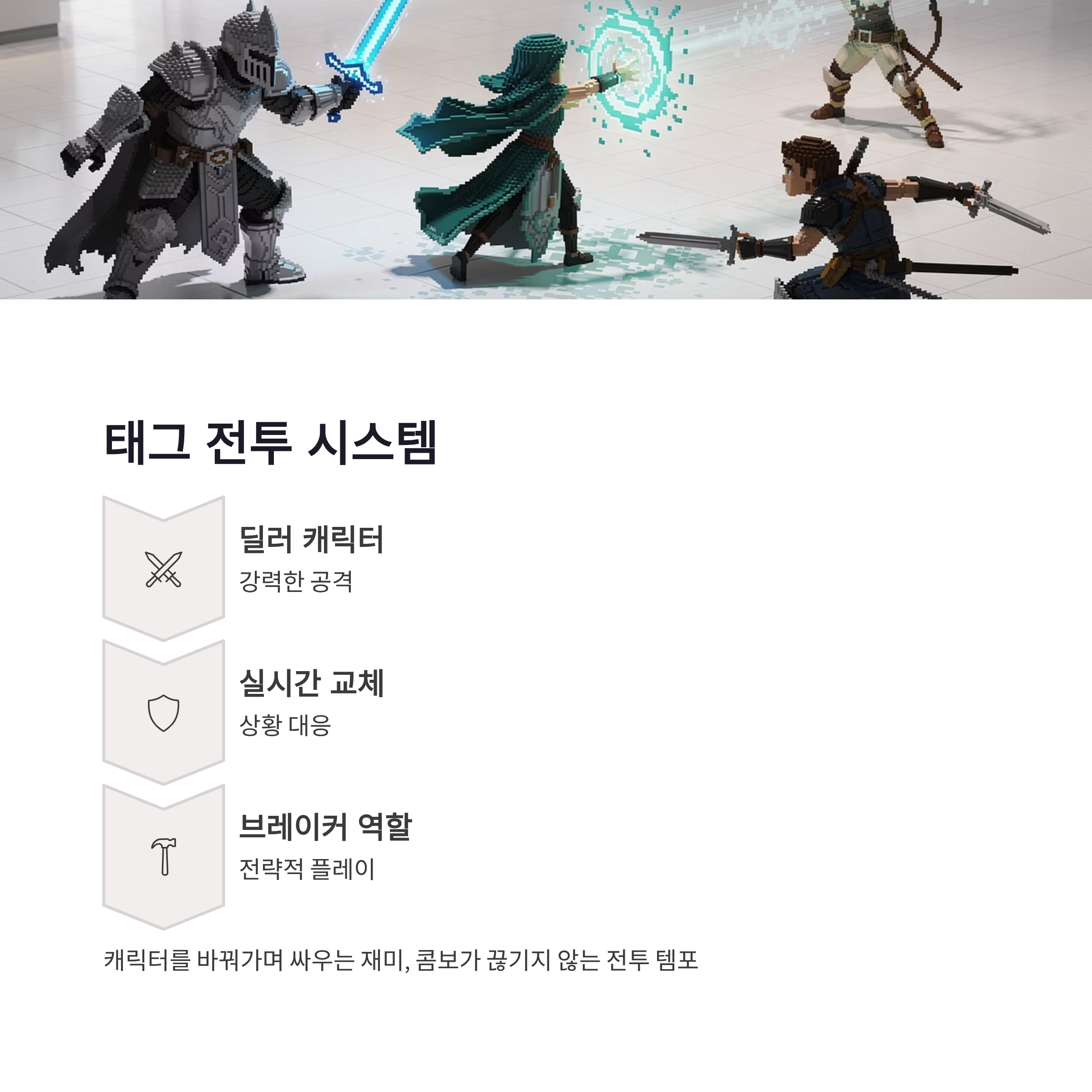 | 태그 전투 | 실시간 캐릭터 교체 | 콤보 이어지는 손맛 |