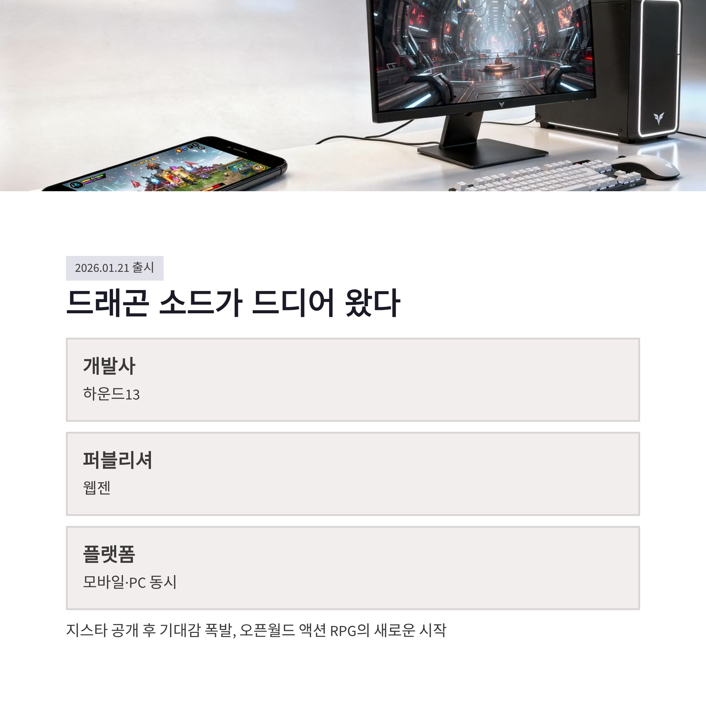 오늘 드래곤 소드가 드디어 정식 출시됐습니다. 2026년 1월 21일 기준, 모바일이랑 PC에서 동시에 즐길 수 있는 오픈월드 액션 RPG라서 출시 전부터 기대감이 꽤 컸는데요. 개발은 하운드13, 퍼블리싱은 웹젠이 맡았다고 해서 신뢰도도 한몫했구요. 저도 지스타에서 처음 공개됐을 때 영상 보고 “아 이건 손맛 쪽이네” 싶었습니다. 실제로 해보니 조작감이 가볍지 않고 묵직한 타격감이 있어서, 버튼 하나 눌렀을 뿐인데 손이 바쁘더라구요. 오픈월드인데 전투 밀도가 높다는 게 첫 느낌이었습니다. 맵 구경만 하다 끝나는 게임은 아니라는 점, 이게 꽤 크게 다가왔어요.