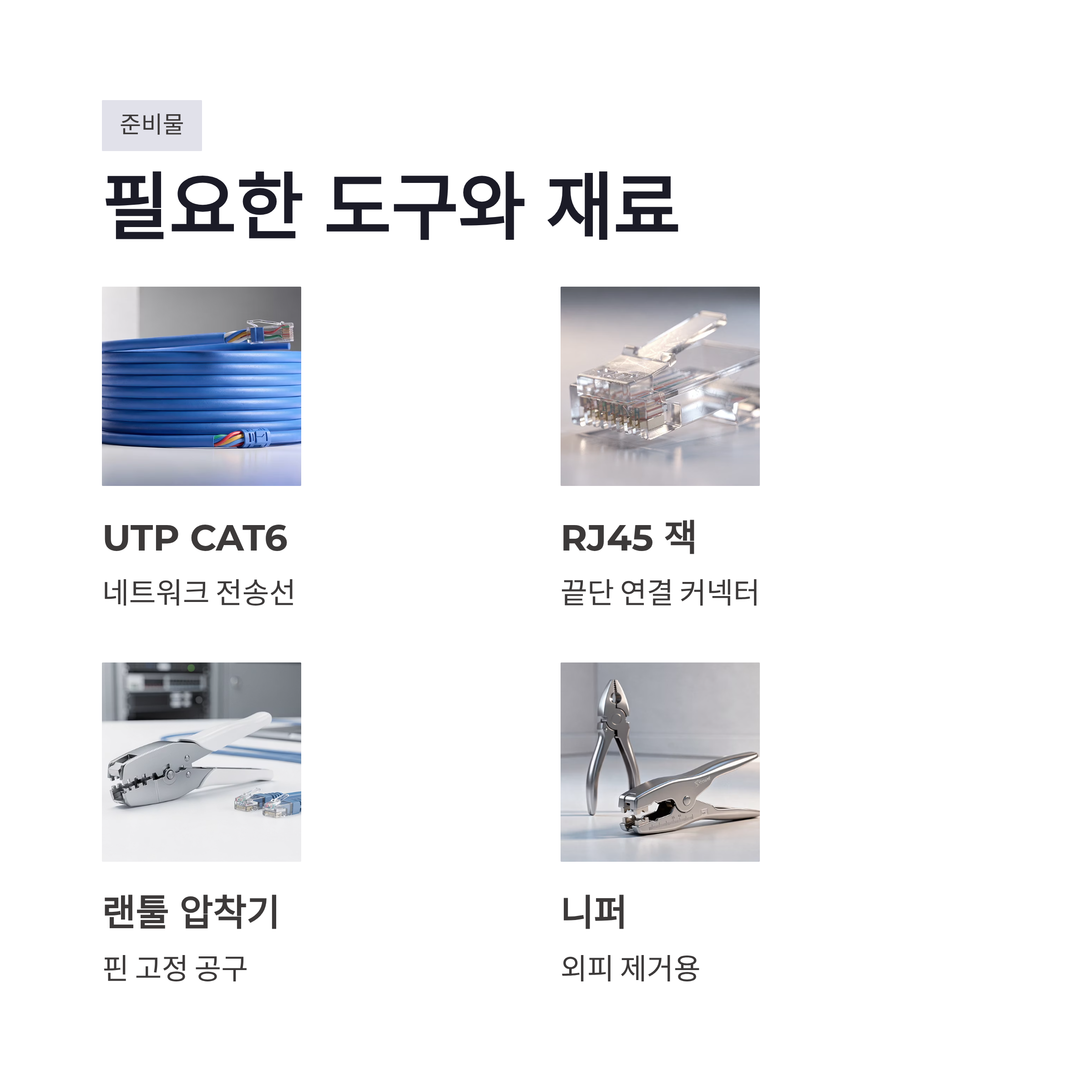 처음엔 도구가 비싸 보이는데 막상 보면 간단합니다. 기본 세트 하나면 충분했어요. 랜선 만들기 방법에 필요한 준비물은 아래 정도면 끝입니다.