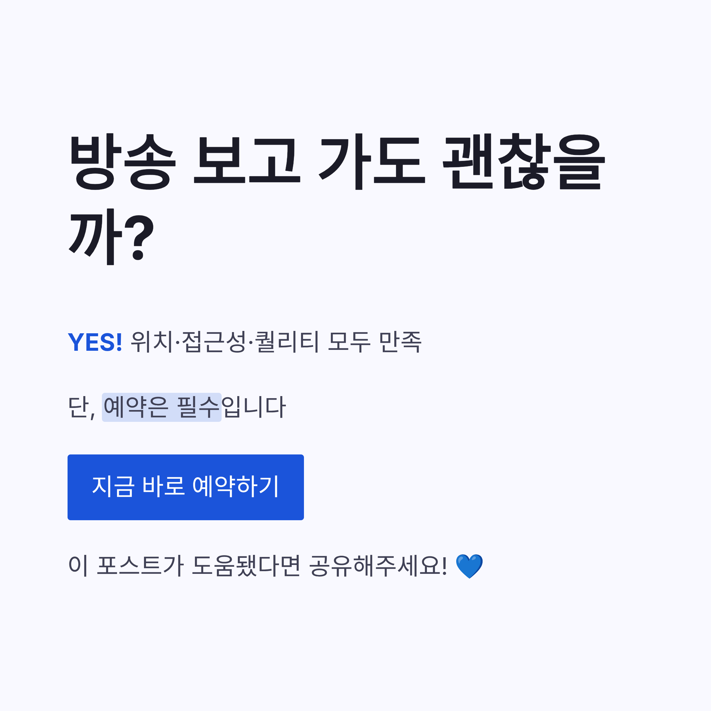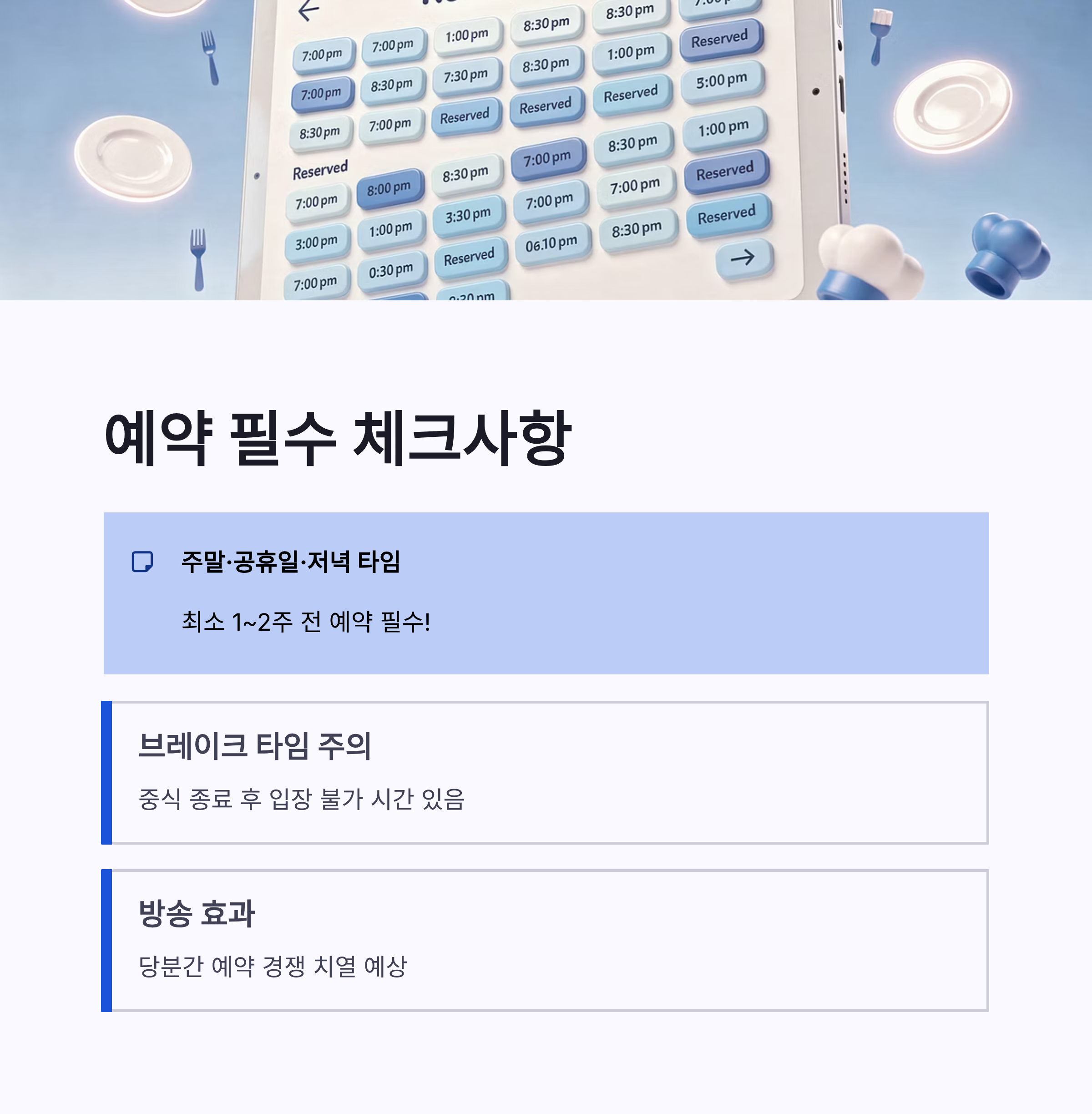 이렇게 가능하구요. 특히 주말, 공휴일, 저녁 타임은 최소 1~2주 전 예약 추천이에요. 방송 이후라 당분간은 더 빡셀 것 같더라구요.