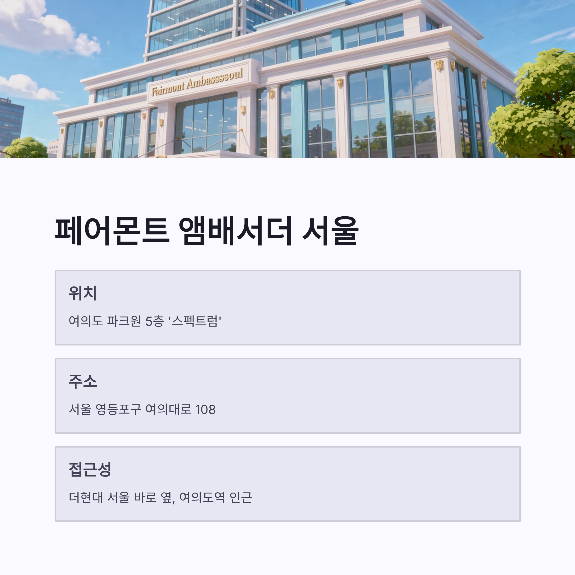주소는 서울 영등포구 여의대로 108 파크원이고, 여의도역이랑도 가까워서 대중교통 접근성도 좋았어요. 호텔 뷔페인데도 부담이 덜한 동선, 이게 은근 중요한 포인트더라구요.