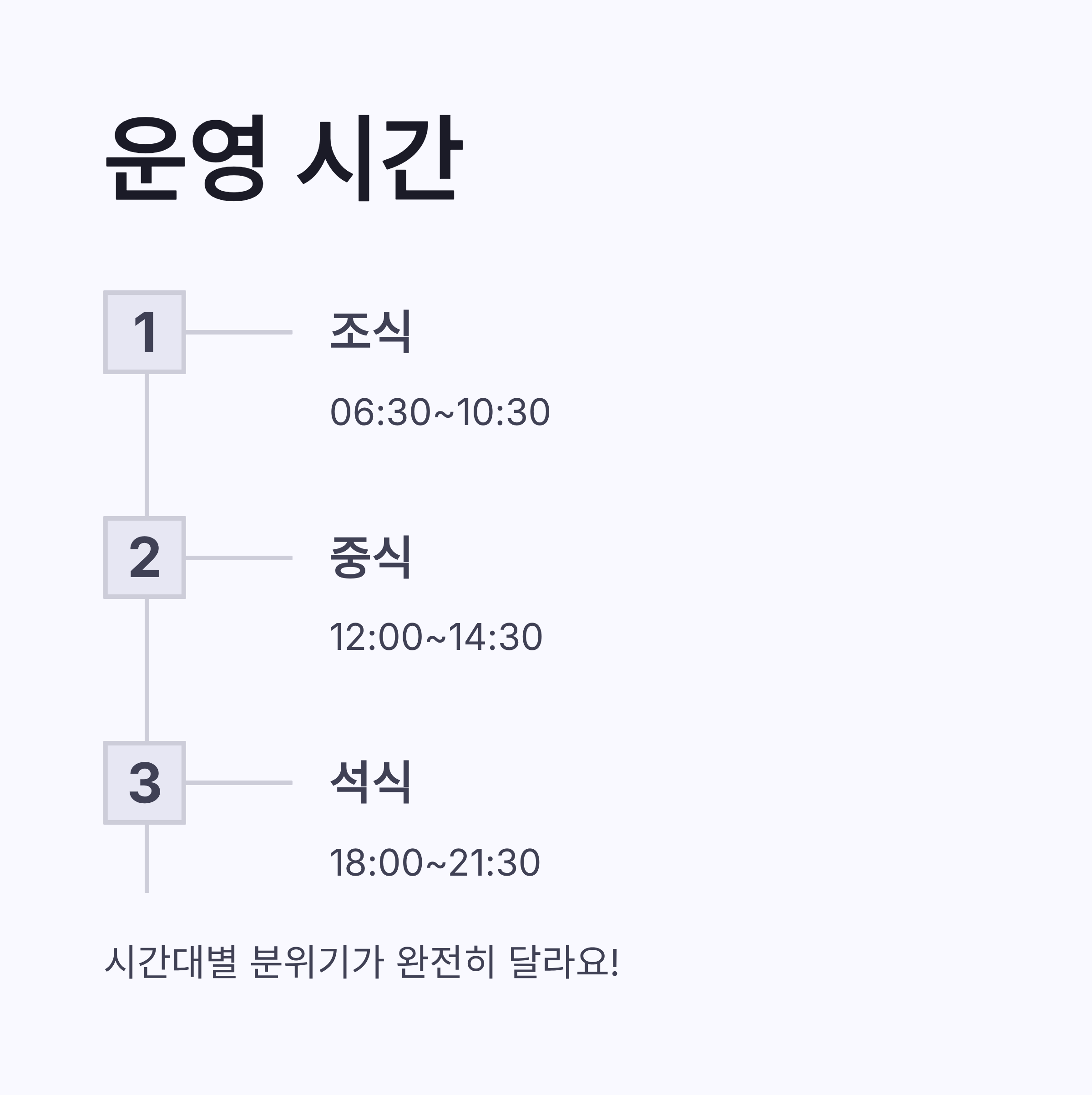* 조식 06:30~10:30 * 중식 12:00~14:30 * 석식 18:00~21:30