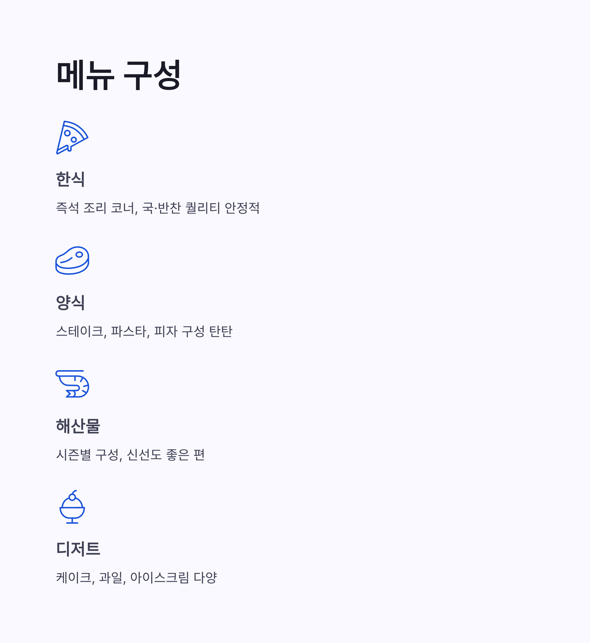 | 디저트 | 케이크, 과일, 아이스크림 다양 |