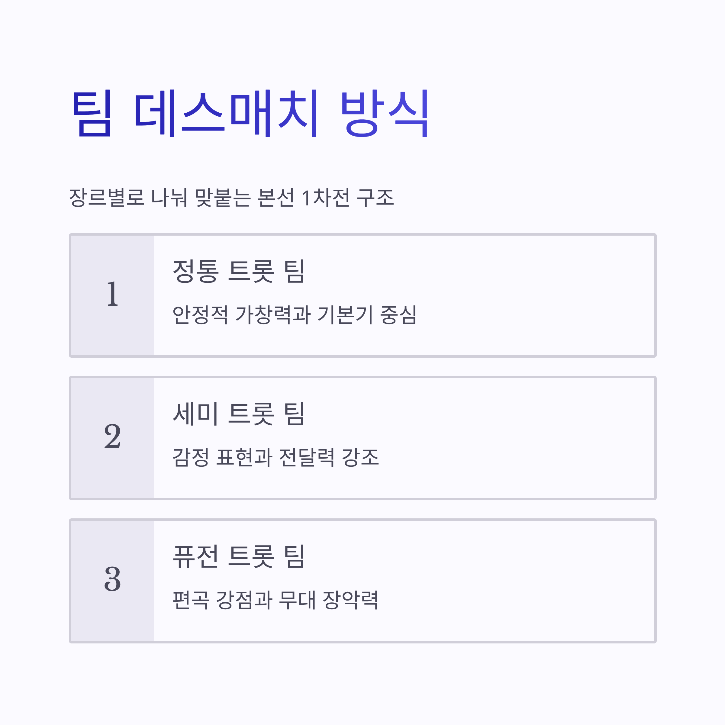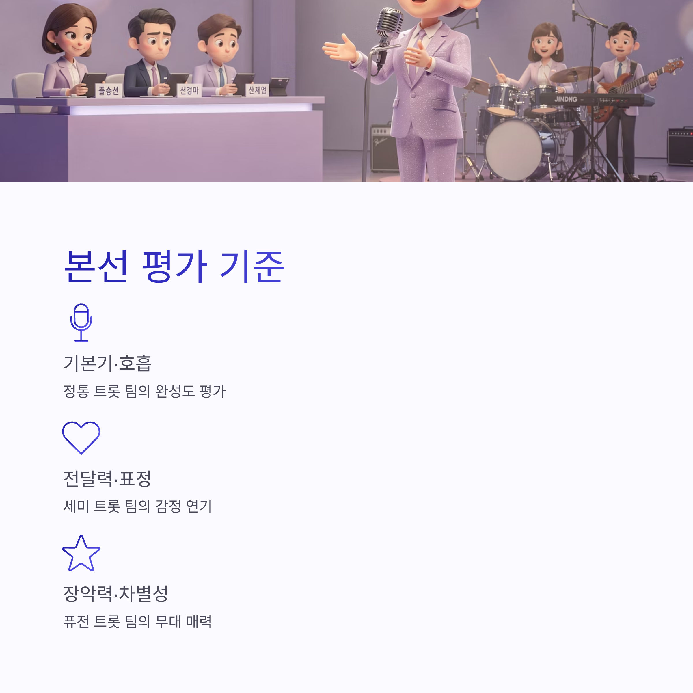 | 정통 트롯 팀 | 안정적인 가창력 | 기본기·호흡 완성도 |