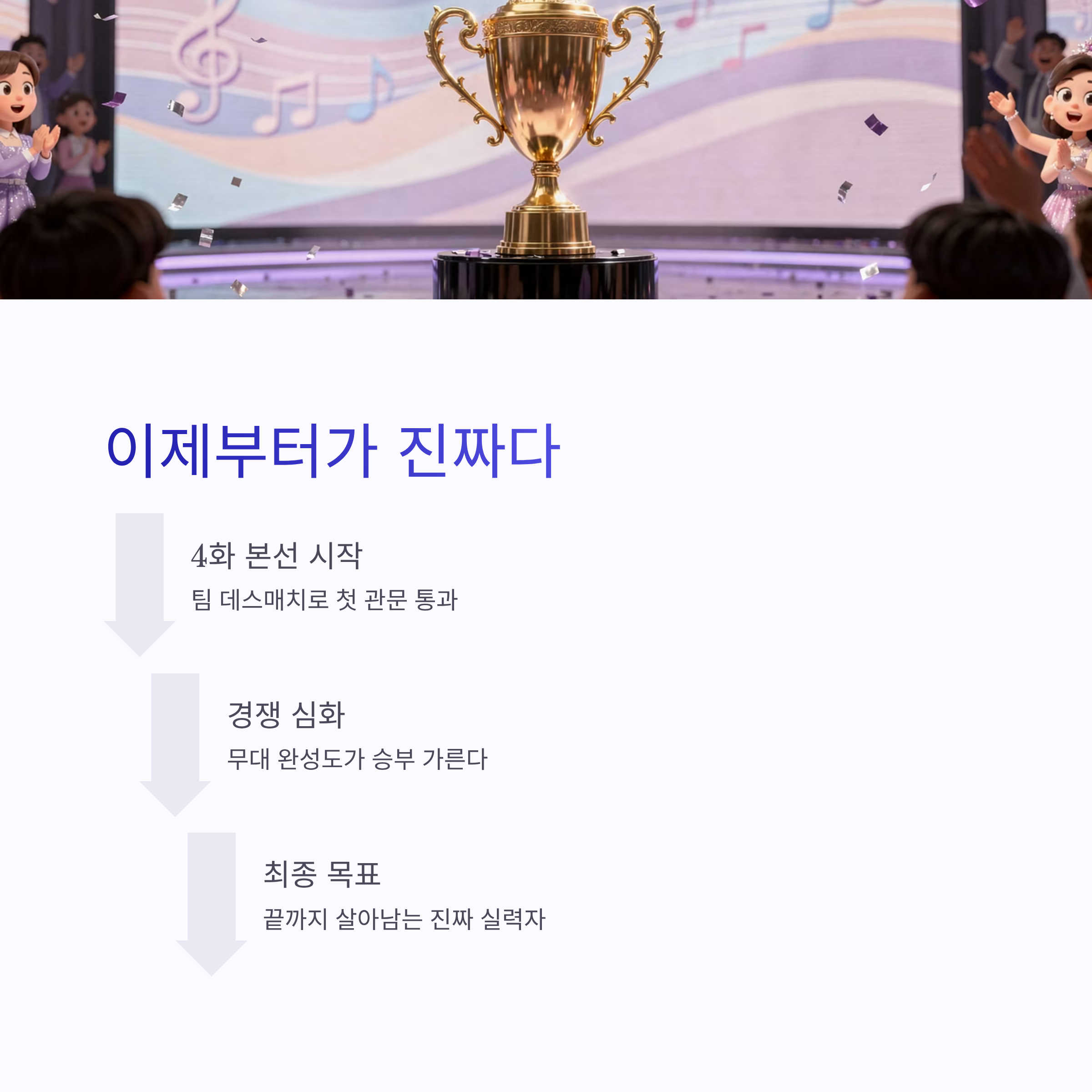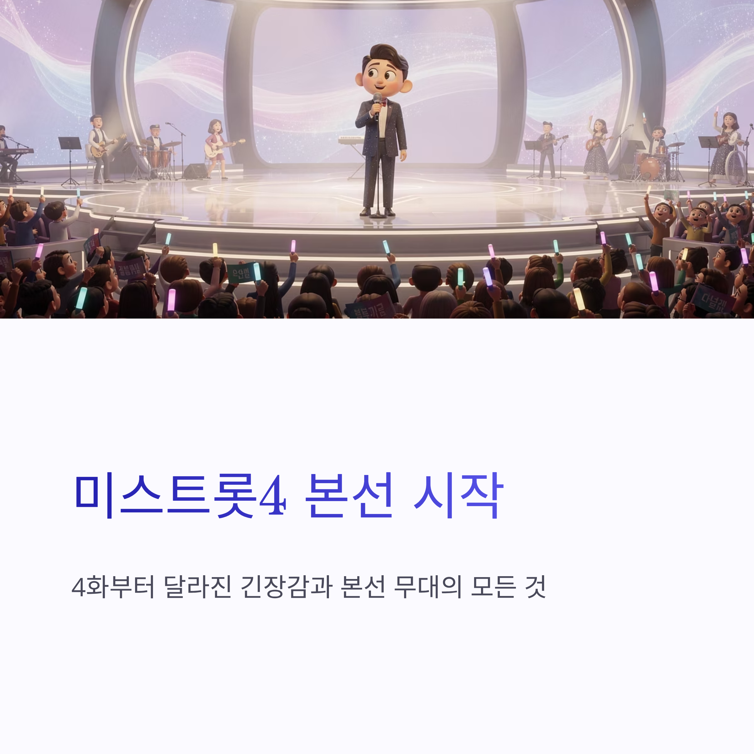 지난 목요일 방송된 미스트롯4 4화는 딱 보자마자 공기가 달랐습니다. 예선 때의 풋풋함보다는, “아 이제 진짜다…” 싶은 긴장감이 확 올라오더라구요. 드디어 미스트롯4 본선이 시작됐고, 그 첫 관문이 바로 장르별 팀 데스매치였죠. 개인 실력도 중요하지만 팀 전체 완성도가 점수에 직접적으로 영향을 주다 보니, 참가자들 표정부터가 확 달라졌습니다. 노래 시작 전 숨 고르는 모습, 서로 눈빛 맞추는 장면까지 괜히 제가 다 긴장됐구요. 본선 무대라는 말이 왜 이렇게 무겁게 느껴지는지 새삼 실감했습니다.