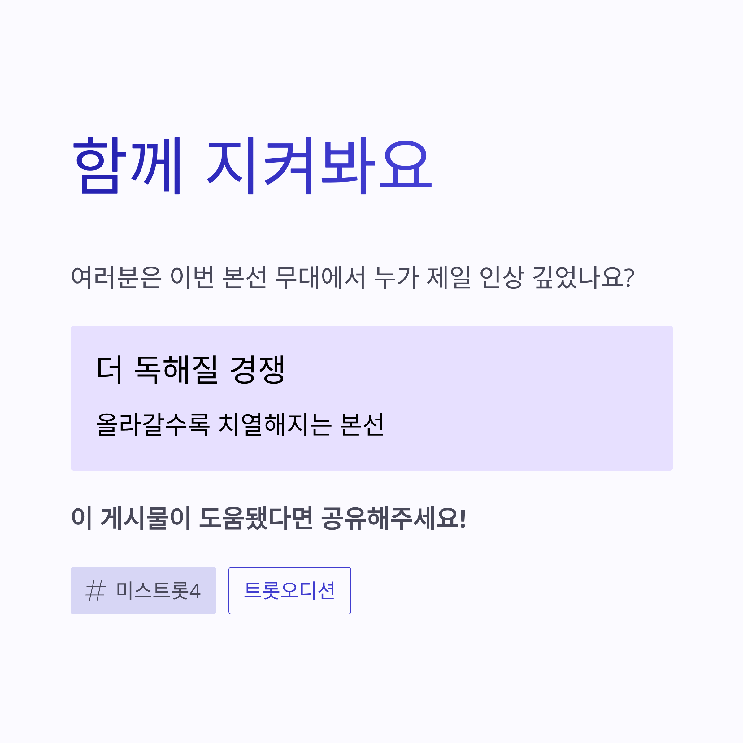 점수 차이가 크진 않았지만, 미스트롯4 본선답게 작은 실수 하나에도 바로 순위가 갈리는 게 느껴졌습니다. 이쯤 되니 “아, 예선이랑은 게임이 다르구나” 싶더라구요.