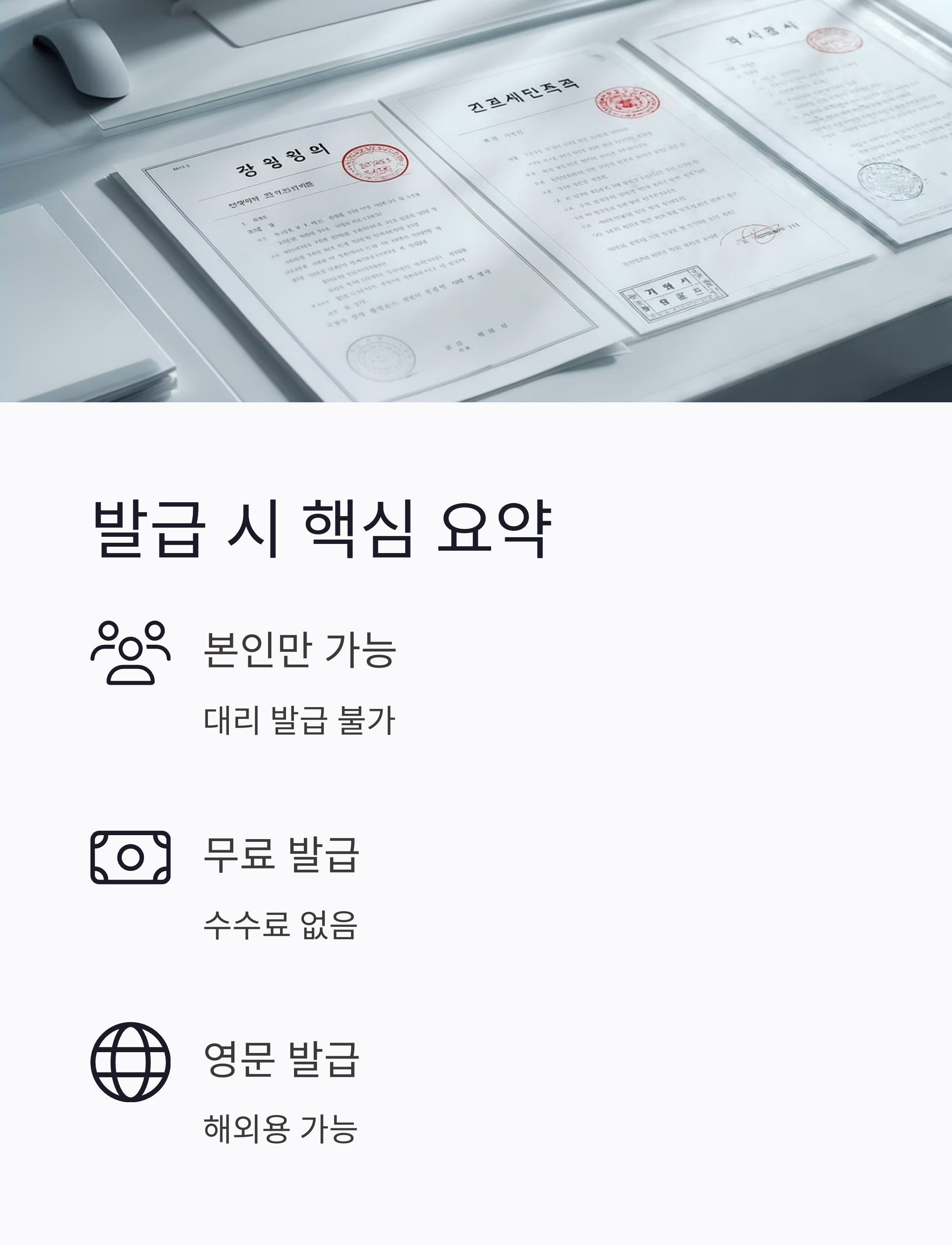 - 취업, 비자 발급, 공직 임용, 자격증 신청 등에 필수 제출