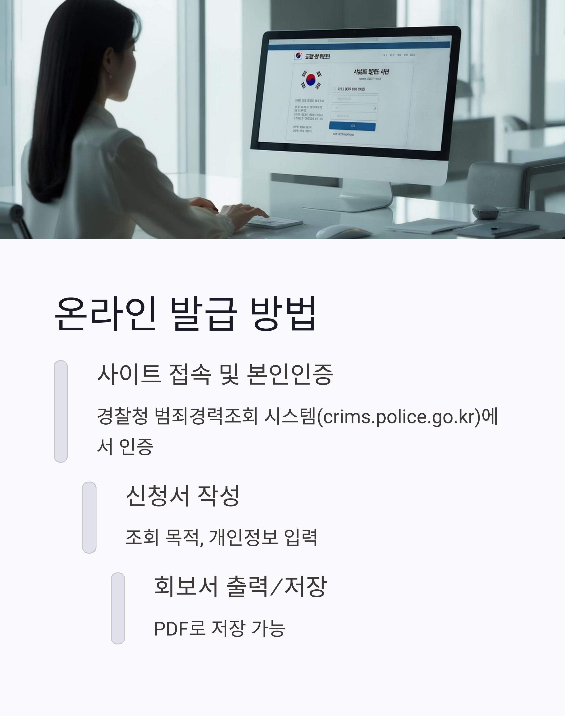 - 온라인(경찰청 범죄경력조회 시스템) 또는 오프라인(경찰서 직접 방문) 모두 가능