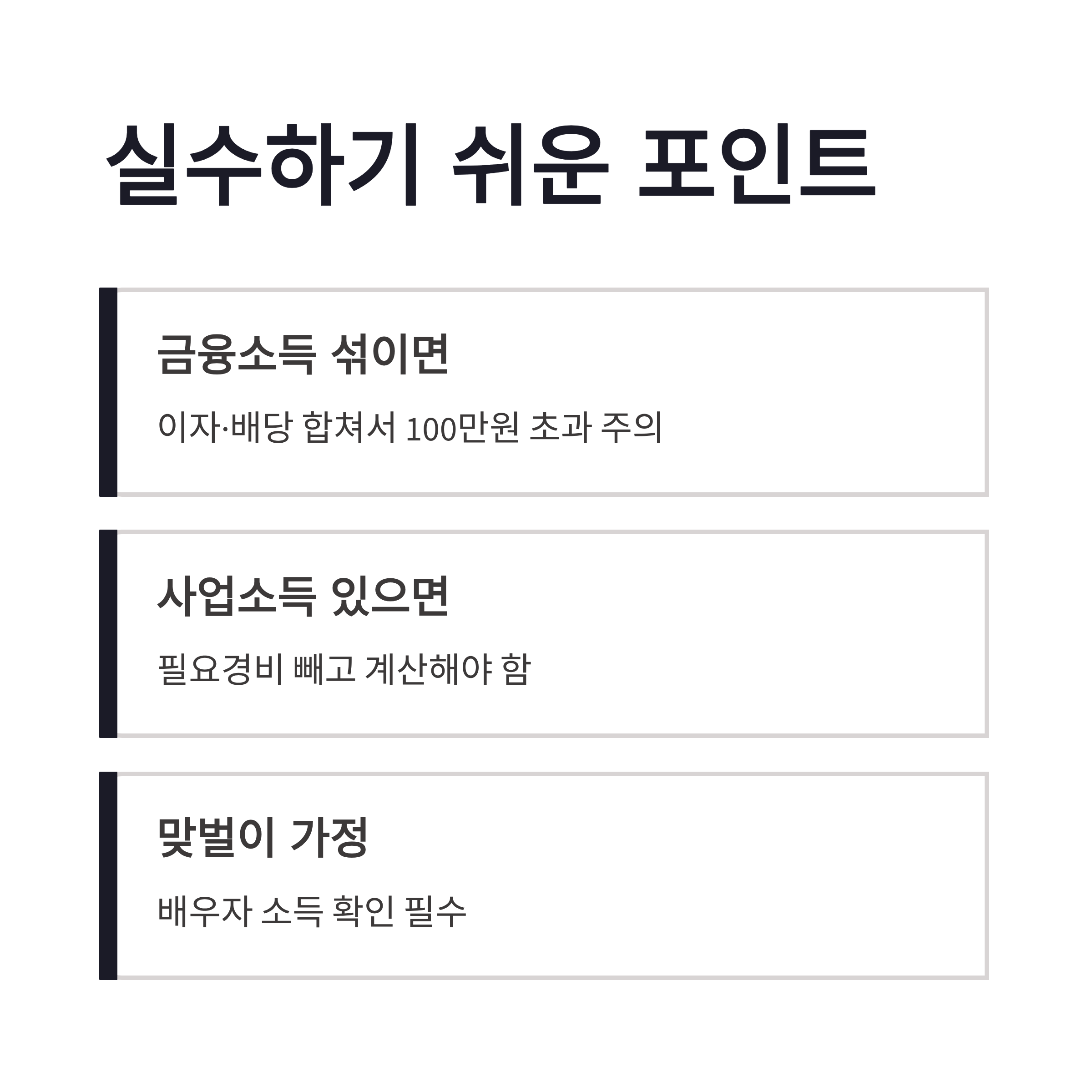 장점은 기준이 명확하다는 점이에요. 숫자로 딱 떨어지니까 계산하면 답이 나옵니다. 단점은… 소득 종류가 여러 개면 계산이 은근 복잡하다는 거 ㅠㅠ