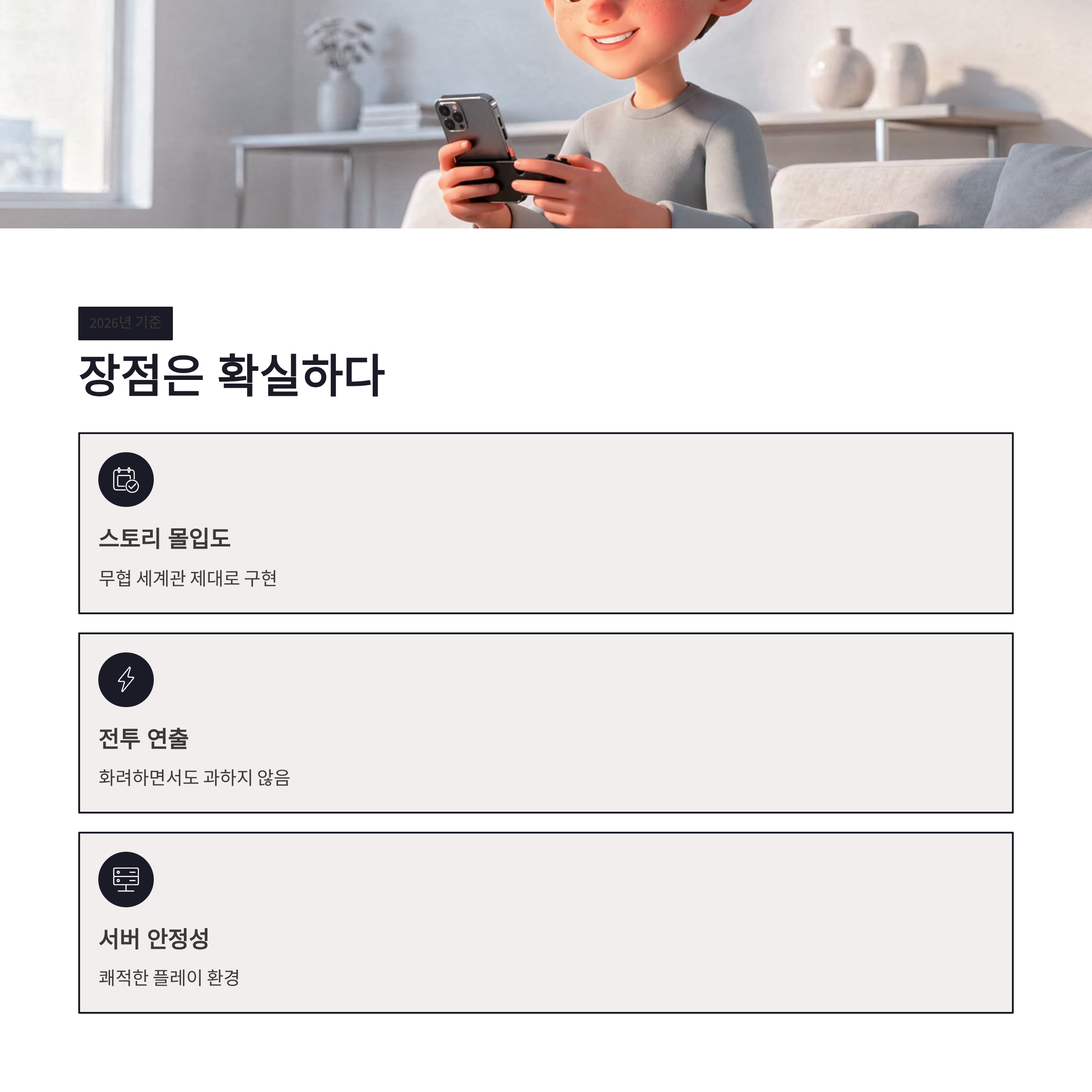 2026년 기준으로 보면 블러드앤소울 모바일은 최신 트렌드와 옛 무협 감성을 적당히 섞은 타입이에요. 장점부터 말하자면 스토리 몰입도, 전투 연출, 서버 안정성은 꽤 만족스러웠구요. 반면 단점도 있긴 했어요. 초반 콘텐츠는 빠르게 소모되는 편이라 어느 순간 반복 느낌이 살짝 옵니다 ㅠㅠ. 그래도 업데이트 주기가 빠른 편이라 이건 개선될 여지가 있어 보였어요. 무과금·소과금 유저도 충분히 즐길 수 있다는 점은 꽤 큰 장점이었구요.