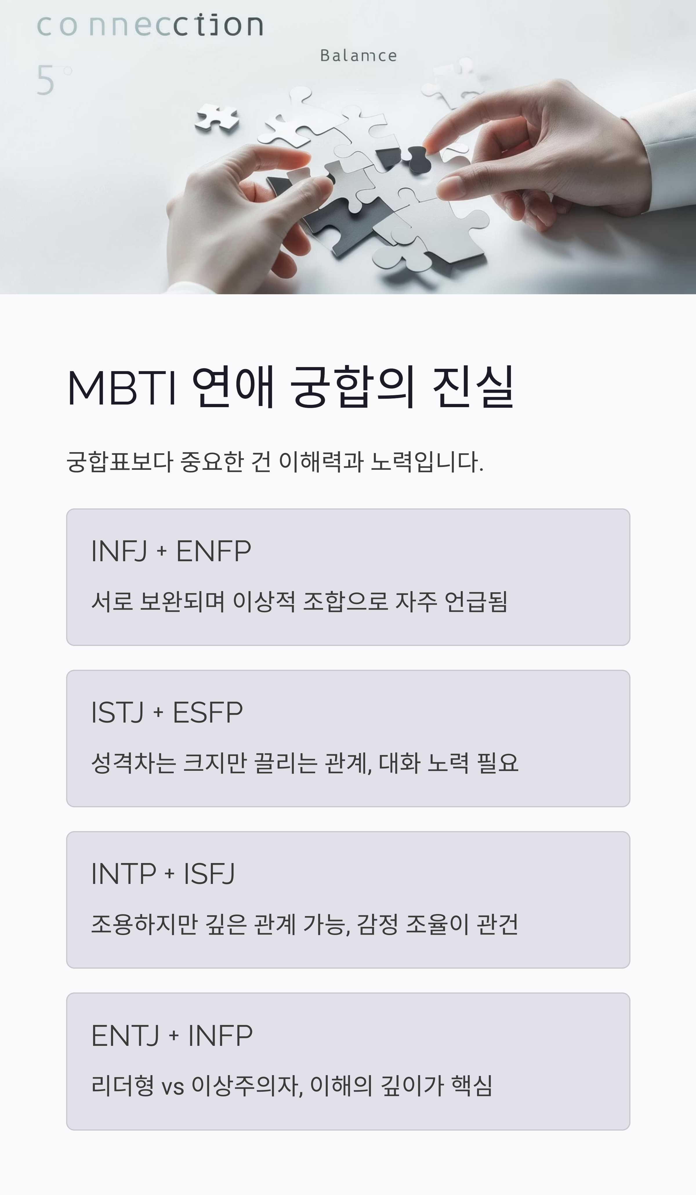 | MBTI 궁합보다 중요한 건 ‘이해도’ | 궁합표에 매이지 않고, 차이를 수용하는 태도가 핵심 |