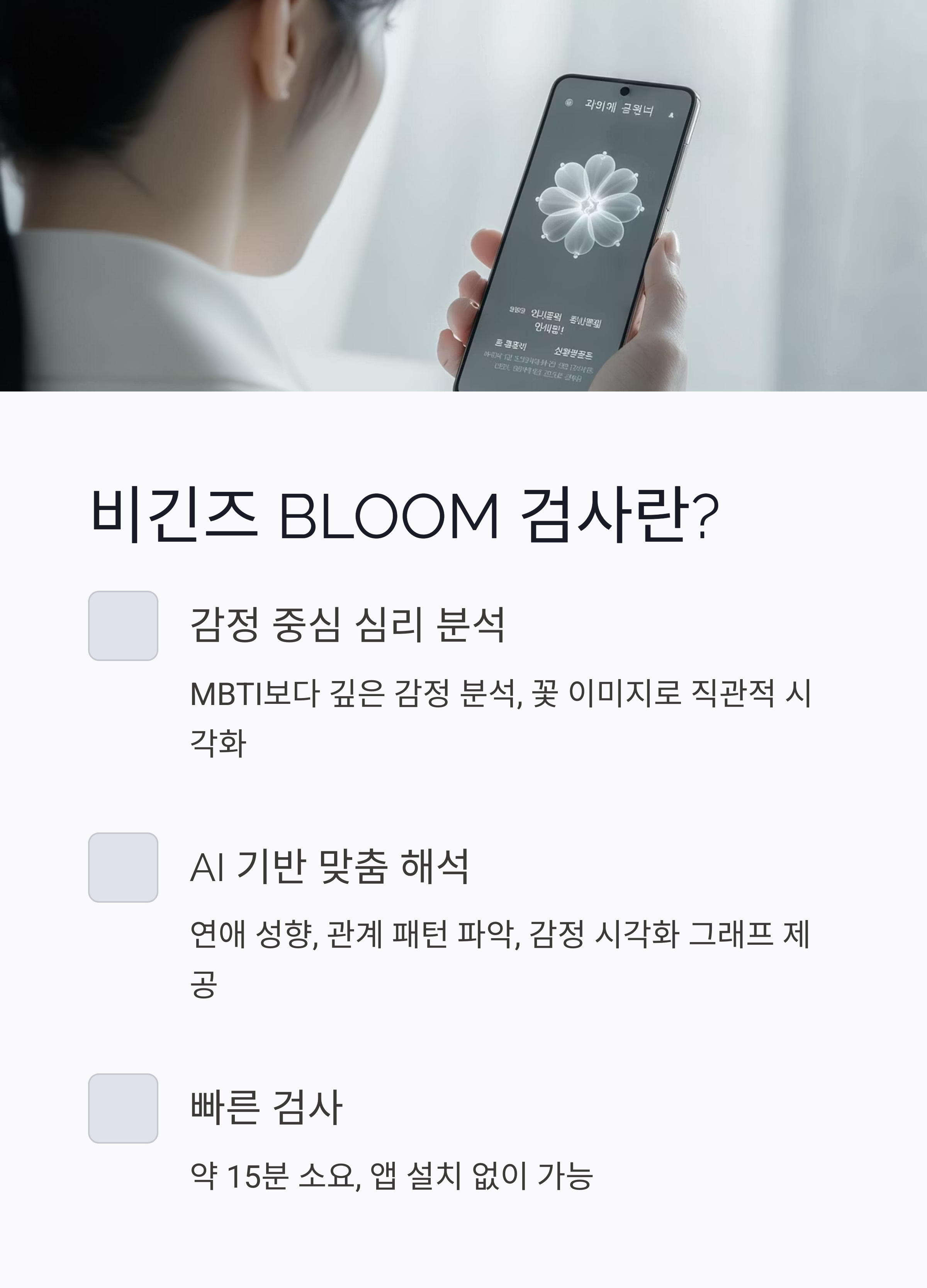 - 비긴즈 BLOOM은 감정 중심 + 시각적 해석 기반 검사