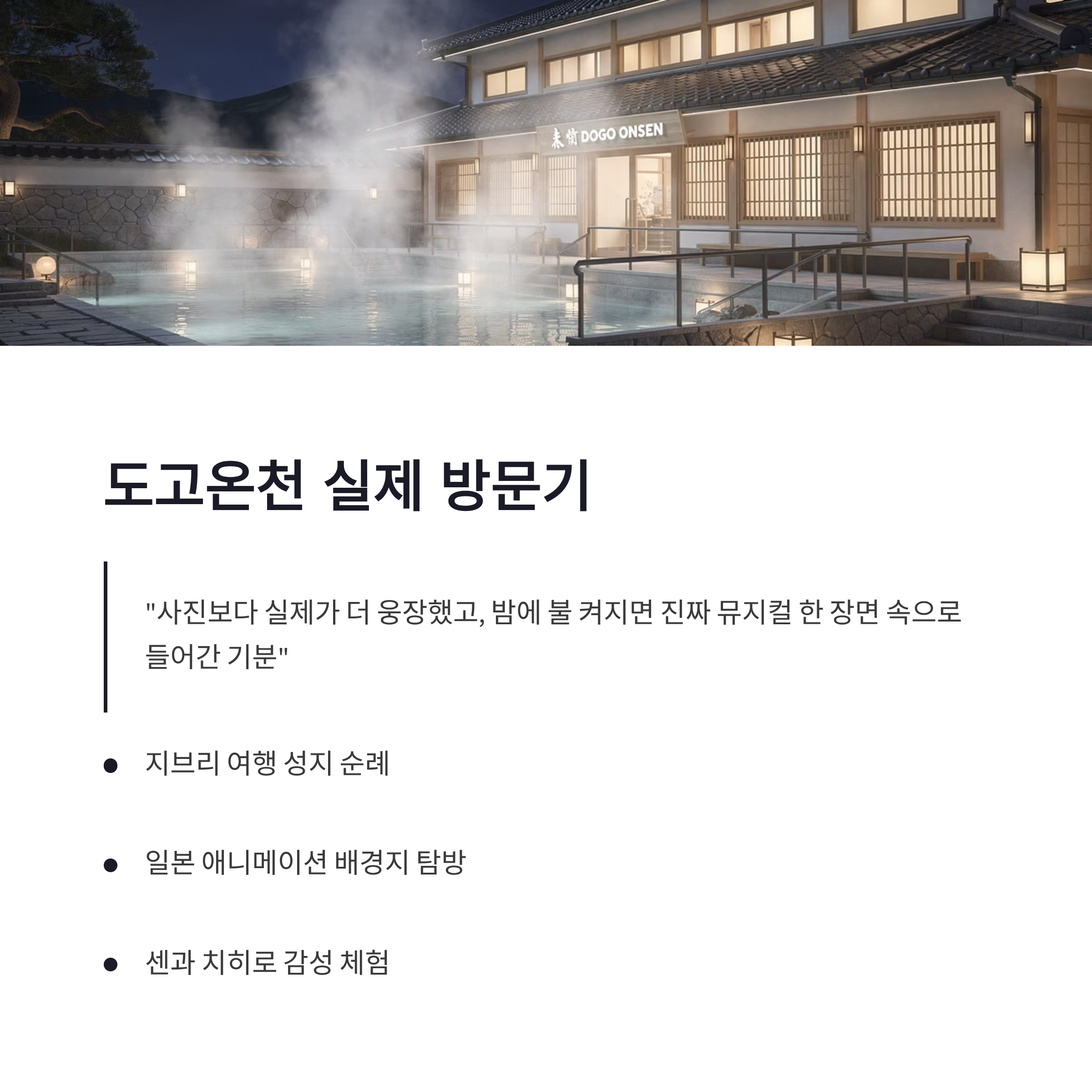 저도 직접 가봤는데요, 도고온천은 사진보다 실제가 더 웅장했구요. 밤에 불 켜지면 진짜 센과치히로의 행방불명 뮤지컬 한 장면 속으로 들어간 기분이었어요. 연관 키워드로 많이 찾는 게 지브리 여행, 일본 애니 성지, 센과 치히로 배경지 이런 쪽이더라구요.