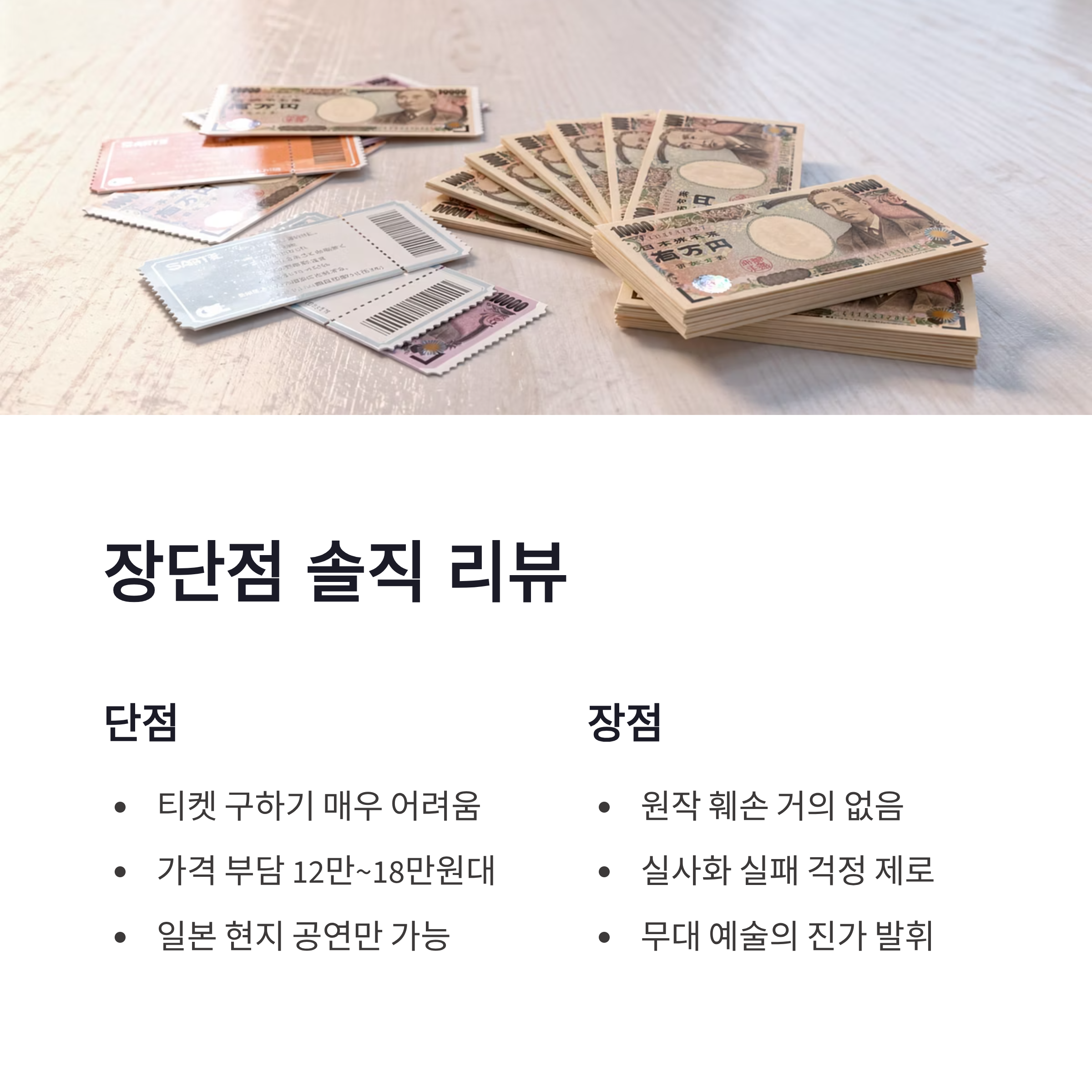 요즘 트렌드는 단순 관람보다 ‘체험형’이에요. 센과치히로의 행방불명 뮤지컬도 단점은 있어요. 티켓 구하기 진짜 어렵고, 가격도 평균 12만~18만 원대로 부담되긴 했구요. 대신 장점은 확실해요. 실사화 실패 걱정 없이, 원작 훼손 거의 없음. 2026년에는 해외 투어 가능성도 언급되고 있어서 기대 중입니다. 개인적으로는 영상화보다 무대가 훨씬 잘 어울리는 작품 같더라구요.