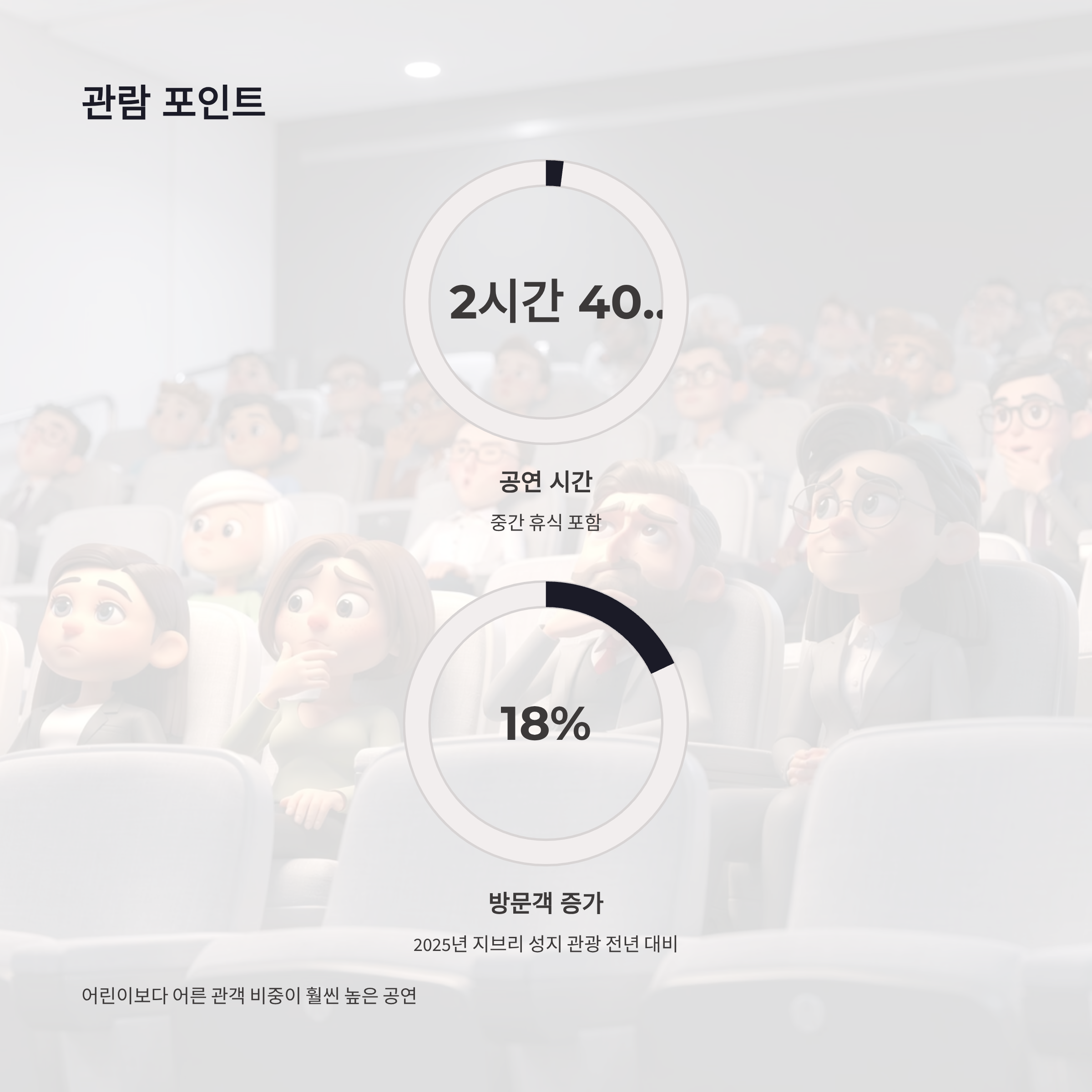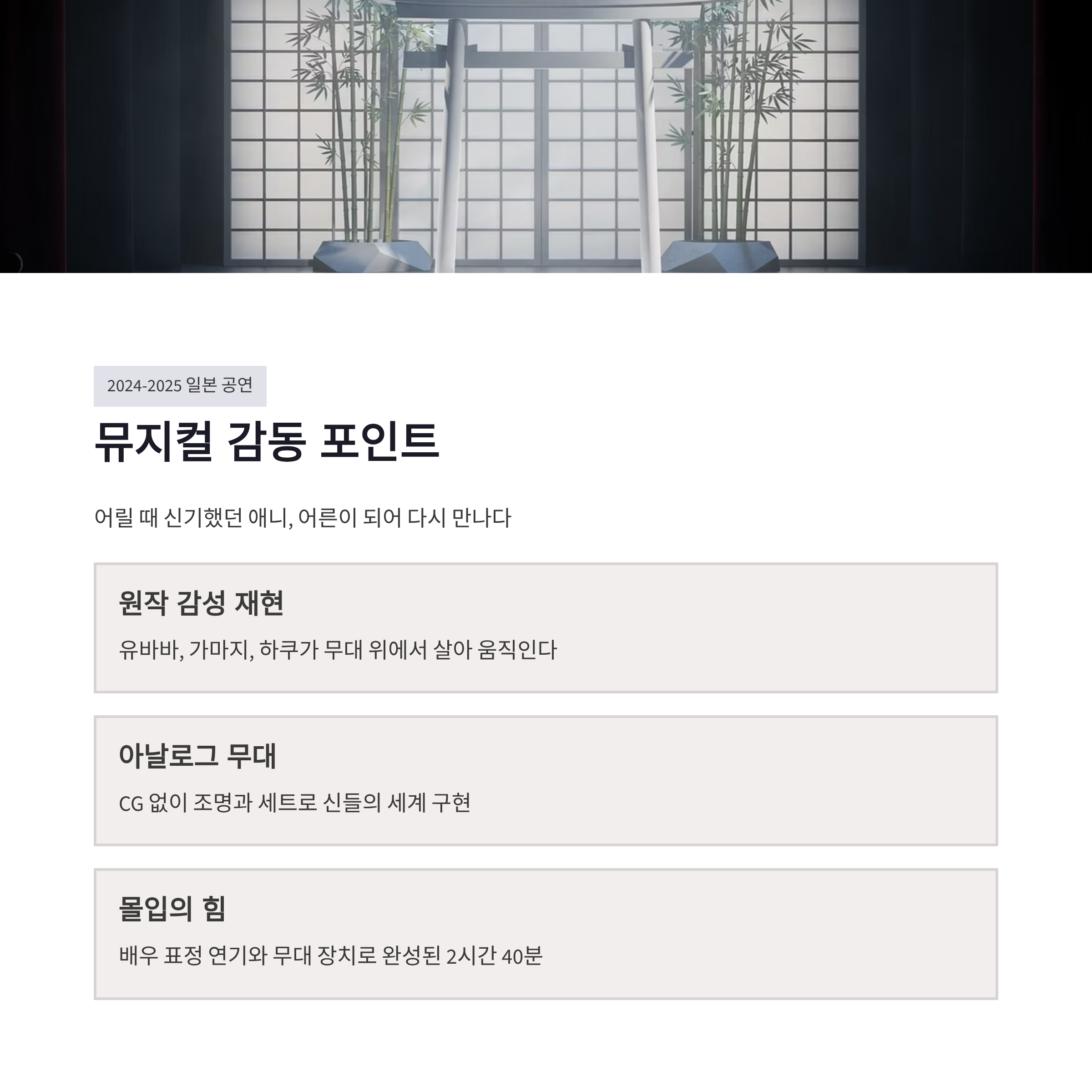 솔직히 말해서요, 센과치히로의 행방불명 뮤지컬 소식 처음 들었을 때 살짝 울컥했구요. 어릴 때는 그냥 신기한 애니였는데, 어른이 되고 다시 보니까 그 의미가 다르더라구요. 2024~2025년 일본에서 공연된 이 작품은 센과 치히로의 행방불명 원작 감성을 거의 그대로 살린 게 포인트예요. 무대 위에 등장하는 유바바, 가마지, 하쿠까지… 와 진짜 살아 움직이는 느낌이랄까. 센과치히로의 행방불명 뮤지컬은 배우들의 표정 연기랑 아날로그 무대 장치가 핵심이었어요. CG 없이 조명과 세트로 신들의 세계를 구현했는데, 오히려 그래서 더 몰입됐습니다. 공연 시간은 약 2시간 40분, 중간 휴식 포함이구요. 어린이보다는 어른 관객 비중이 훨씬 높았던 것도 인상적이었네요.