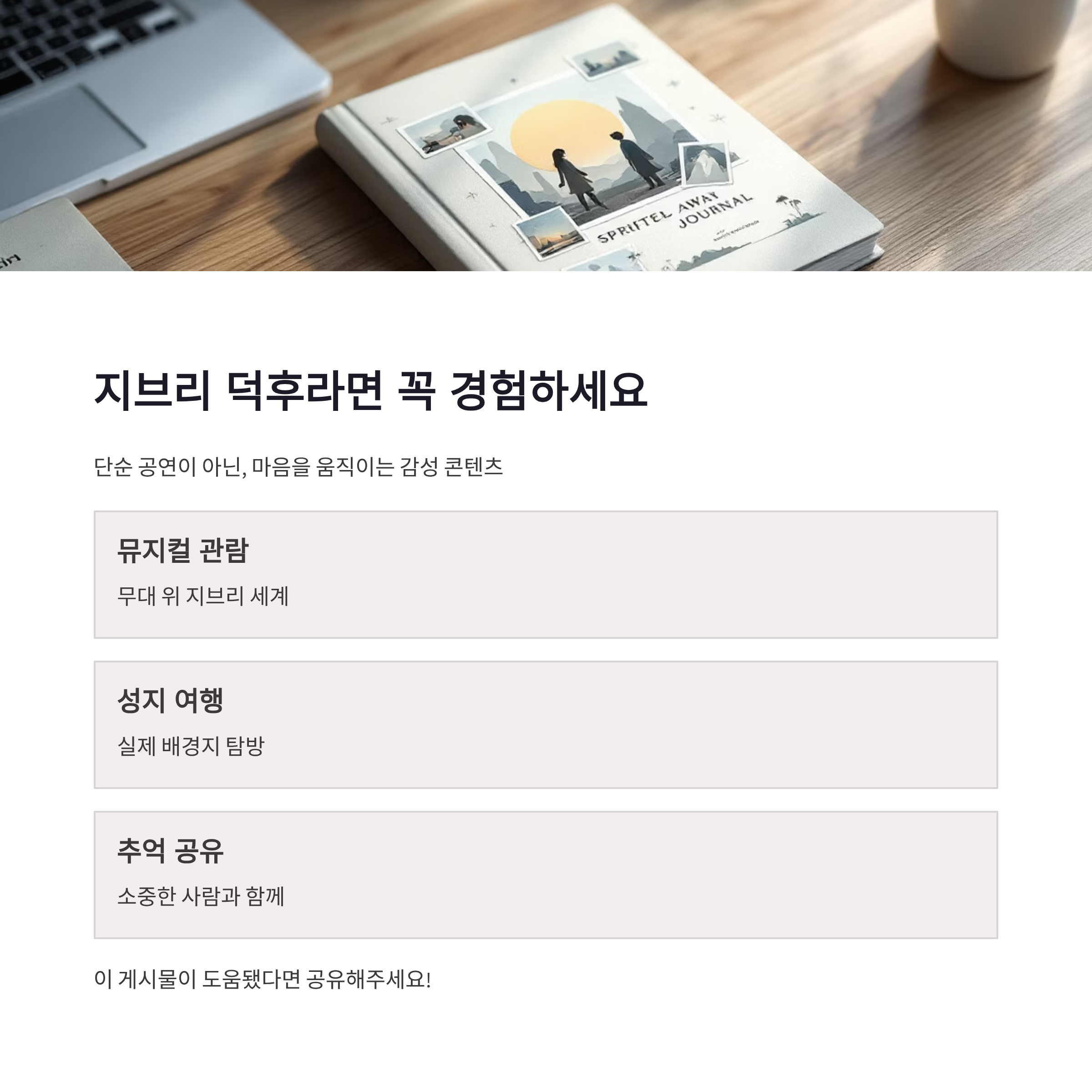 정리하자면 센과치히로의 행방불명 뮤지컬은 단순 공연이 아니라, 기억을 건드리는 경험이었어요. 보고 나면 여행 가고 싶어지고, 다시 영화도 보게 되구요. 이런 감성 콘텐츠, 요즘 참 귀하잖아요 ㅎㅎ 지브리 좋아한다면 한 번쯤은 꼭 경험해보는 거 추천하겠심다!