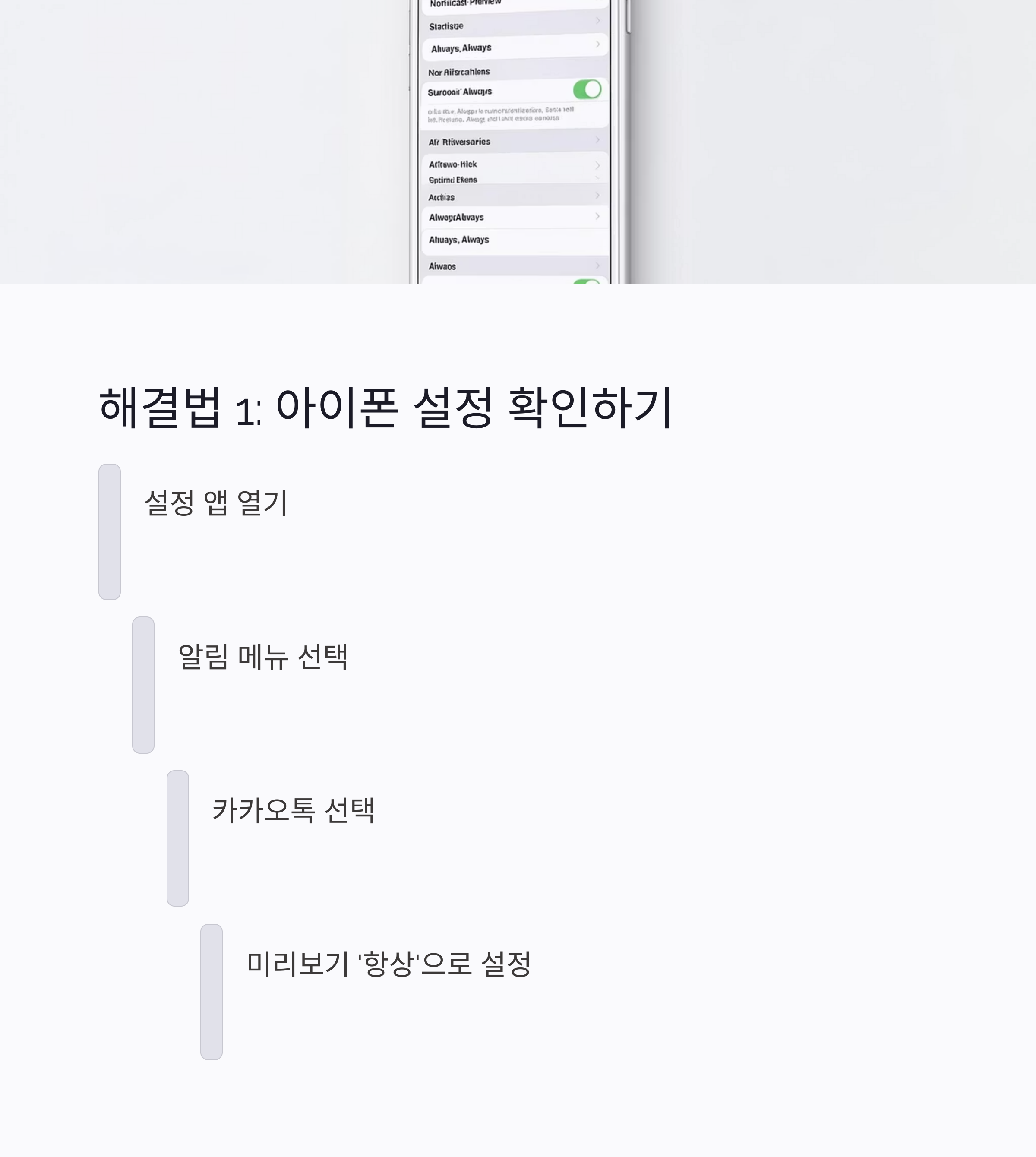 | 아이폰 자체 | 설정 → 알림 → 카카오톡 | 미리보기 → 항상 |