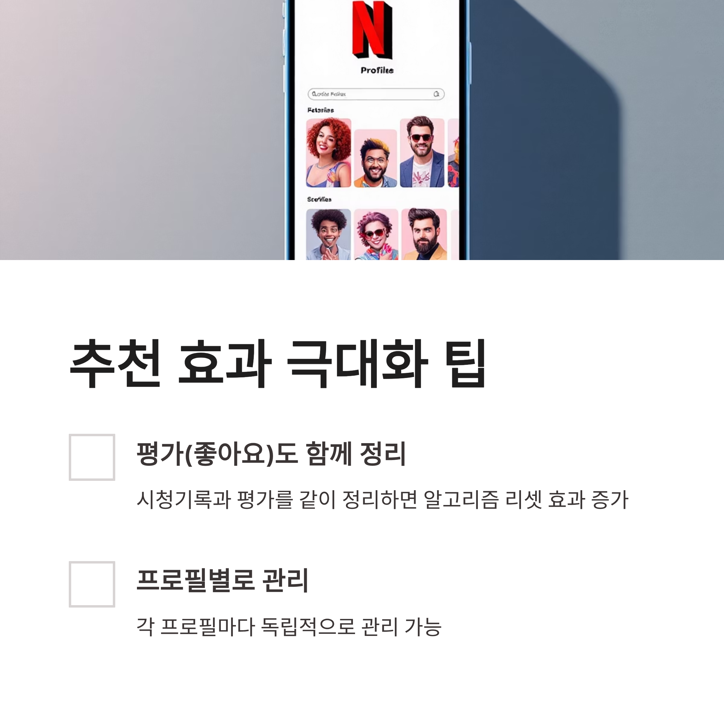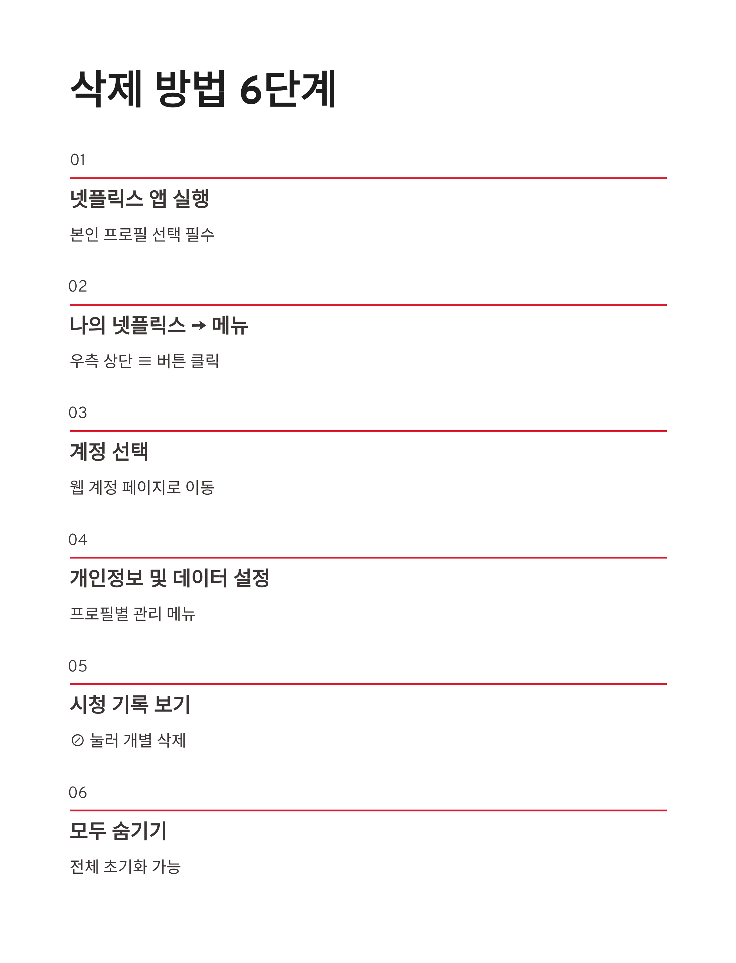 | 단계 | 경로 | 핵심 포인트 | | -- | -------------- | ------------ | | 1 | 넷플릭스 앱 실행 | 본인 프로필 선택 필수 | | 2 | 나의 넷플릭스 → 메뉴 | 우측 상단 ≡ 버튼 | | 3 | 계정 선택 | 웹 계정 페이지로 이동 | | 4 | 개인 정보 및 데이터 설정 | 프로필별 관리 | | 5 | 시청 기록 보기 | ⊘ 눌러 개별 삭제 | | 6 | 모두 숨기기 | 전체 초기화 가능 |
