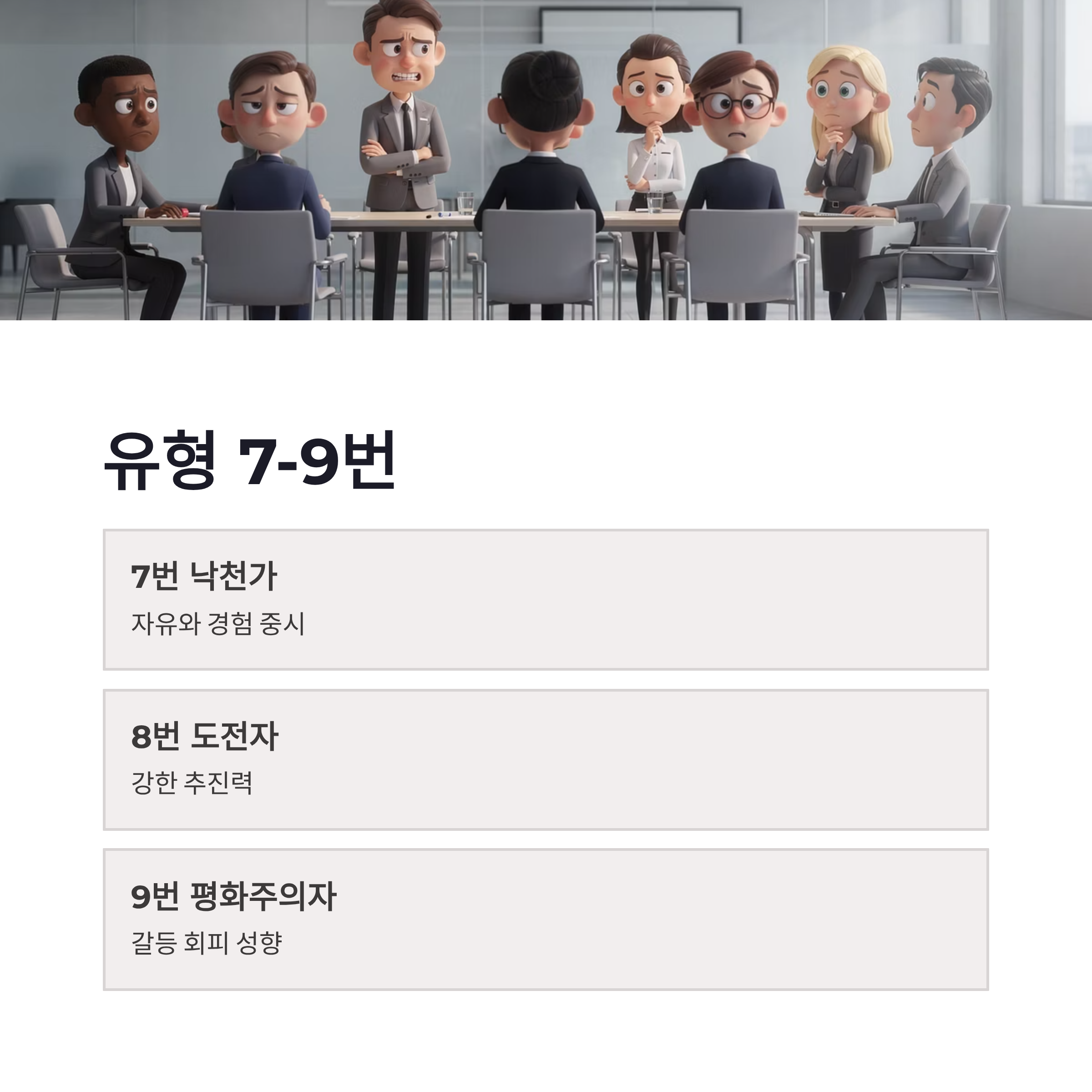 | 유형 | 핵심 키워드 | 특징 요약 | | -- | ------ | ------------- | | 1번 | 완벽 | 기준 높고 스스로 엄격함 | | 2번 | 도움 | 타인 욕구에 민감 | | 3번 | 성취 | 인정받고 싶은 욕망 | | 4번 | 개성 | 감정 깊고 예민 | | 5번 | 관찰 | 혼자만의 영역 중요 | | 6번 | 안정 | 불안 대비형 | | 7번 | 즐거움 | 자유·경험 중시 | | 8번 | 통제 | 강한 추진력 | | 9번 | 평화 | 갈등 회피 성향 |