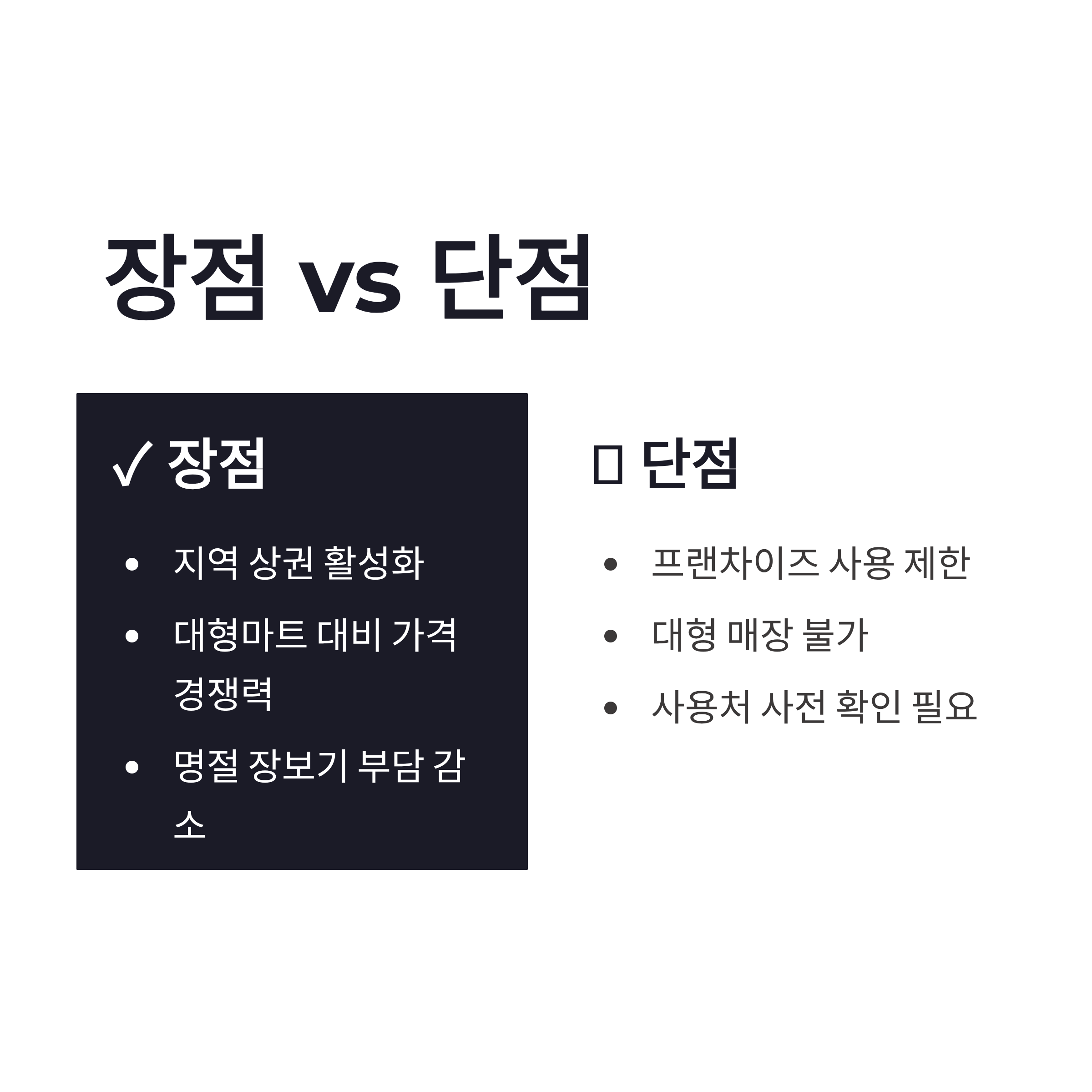 장점은 확실해요. 지역 상권 살리는 느낌도 들고, 대형마트보다 가격 경쟁력 있는 곳도 많아서 장바구니가 가벼워집니다. 단점이라면 프랜차이즈나 대형 매장에서는 사용이 안 되는 경우가 많다는 점 정도? 그래도 설 명절 준비용으로는 충분히 활용 가치 있었습니다. 온누리상품권 설날 할인 목적이라면 사용처는 크게 걱정 안 해도 될 것 같아요.