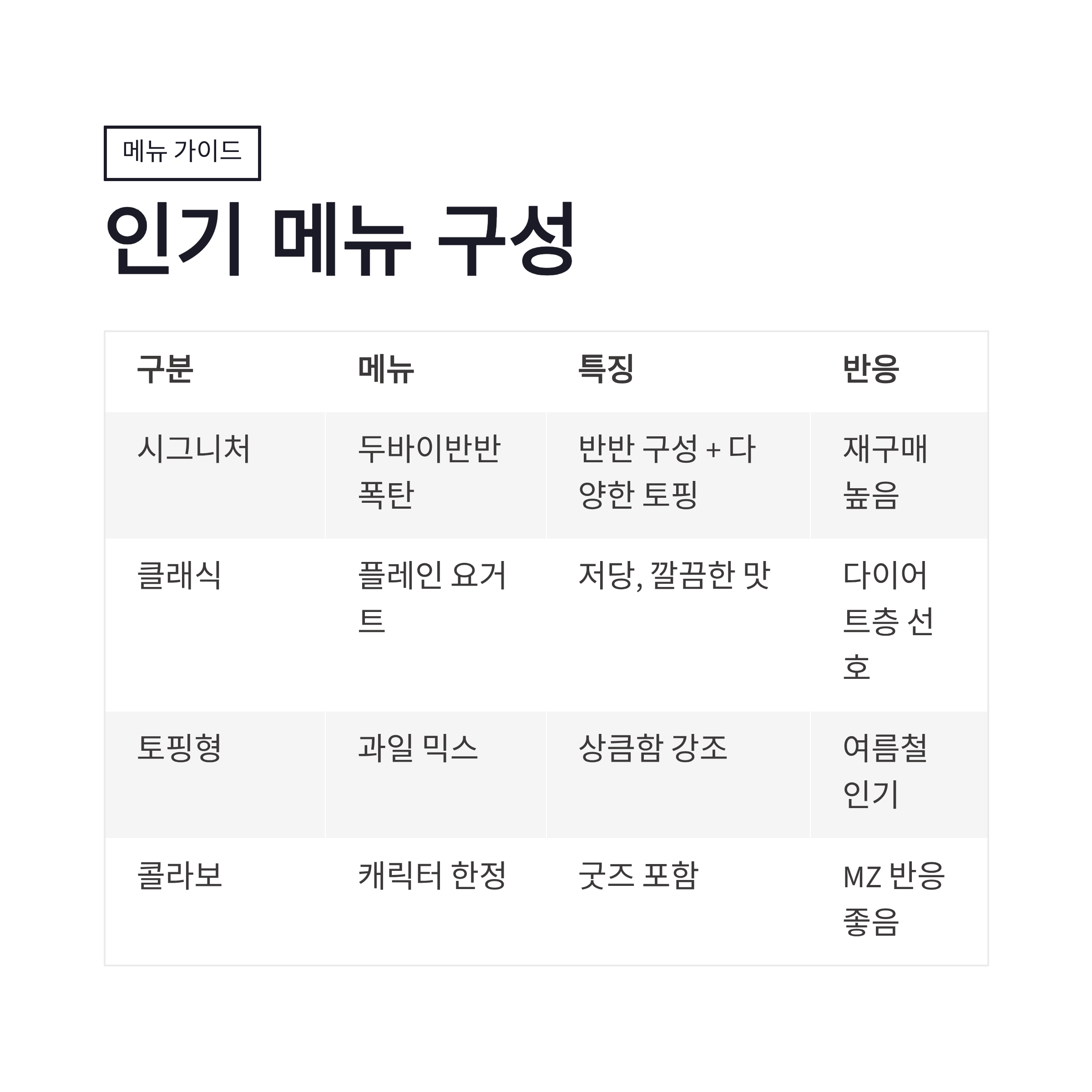 | 구분 | 인기 메뉴 | 특징 | 반응 |
