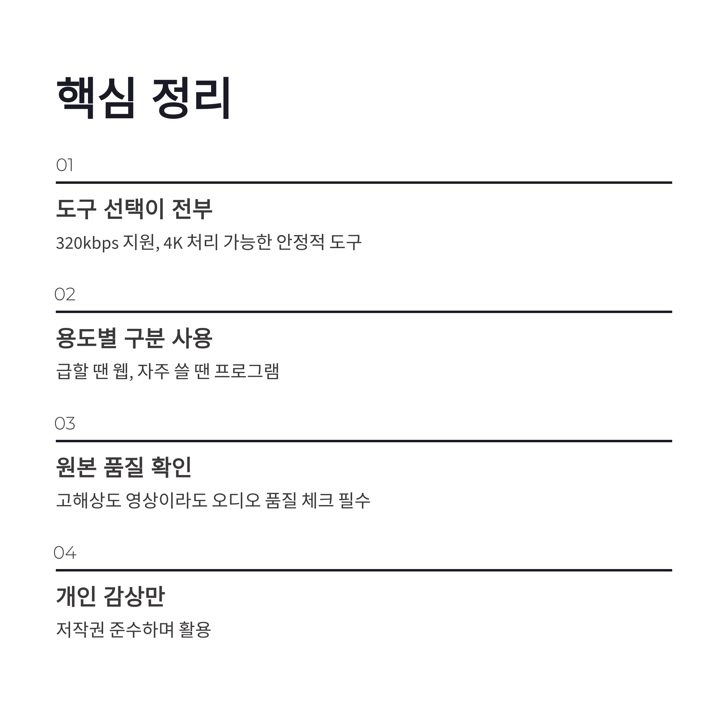 정리해보면, 유튜브 오디오 추출은 도구만 제대로 고르면 진짜 어렵지 않습니다. 4K 영상도 문제 없이 처리 가능했고, MP3로 변환해두니 활용도가 확 올라갔구요. 출퇴근길, 운동할 때, 공부할 때 은근히 자주 쓰게 되더라구요.