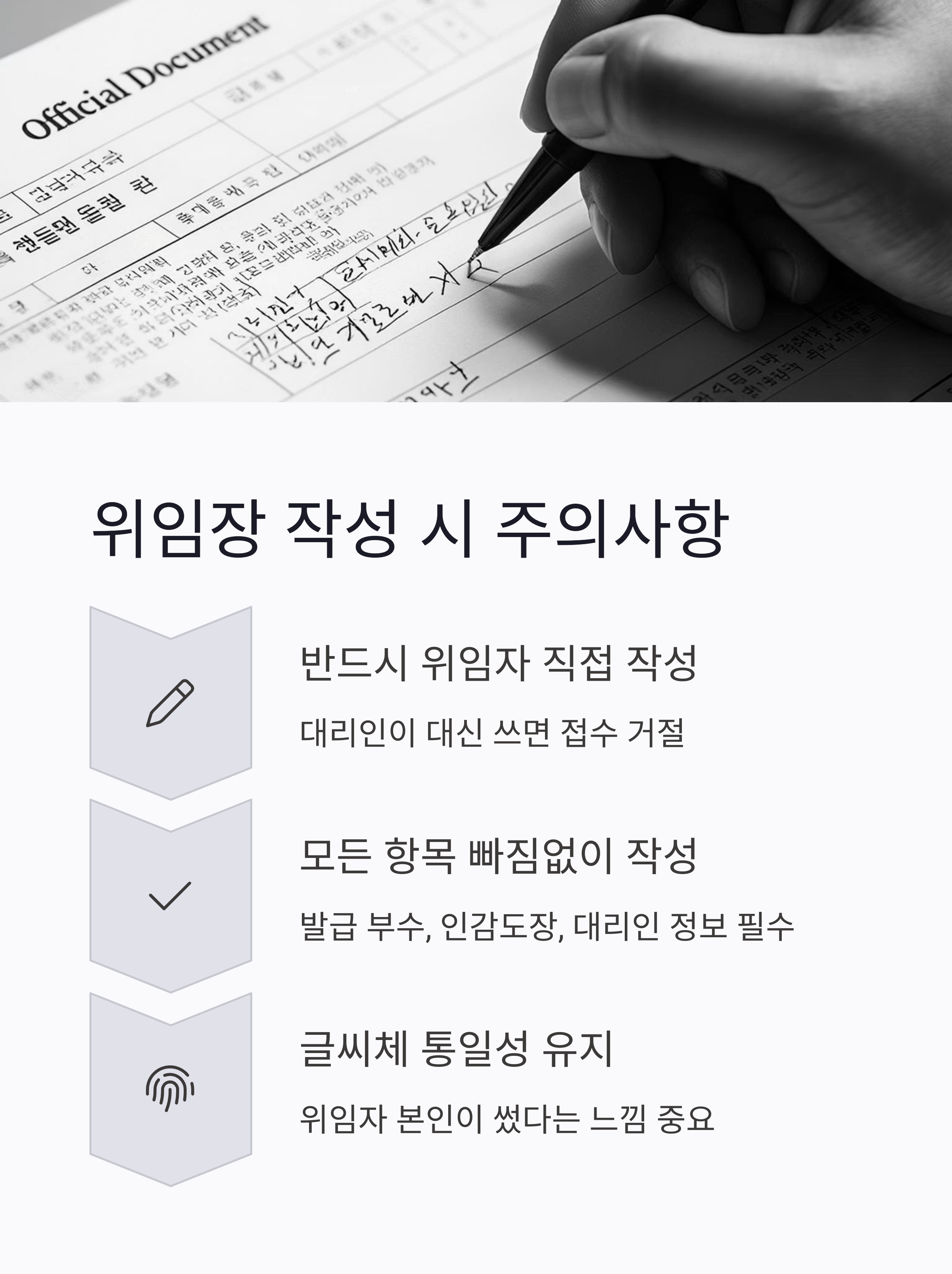 - 무조건 위임자가 직접 손글씨로 작성해야 합니다. 대리인이 쓰면 접수 거절!
