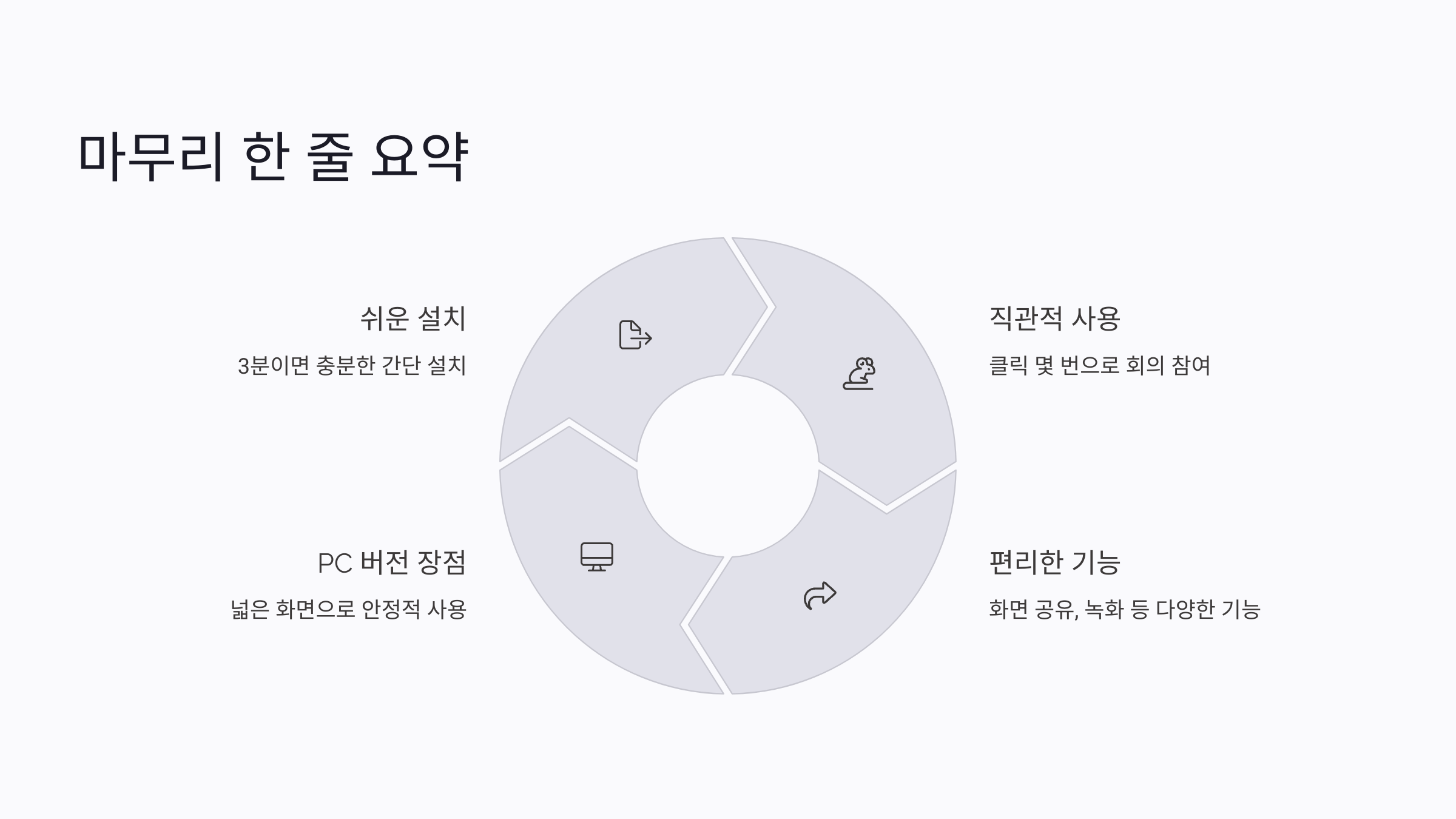 | 회의 녹화 | PC 저장 or 클라우드 저장 가능 (유료 기능 일부 포함) |