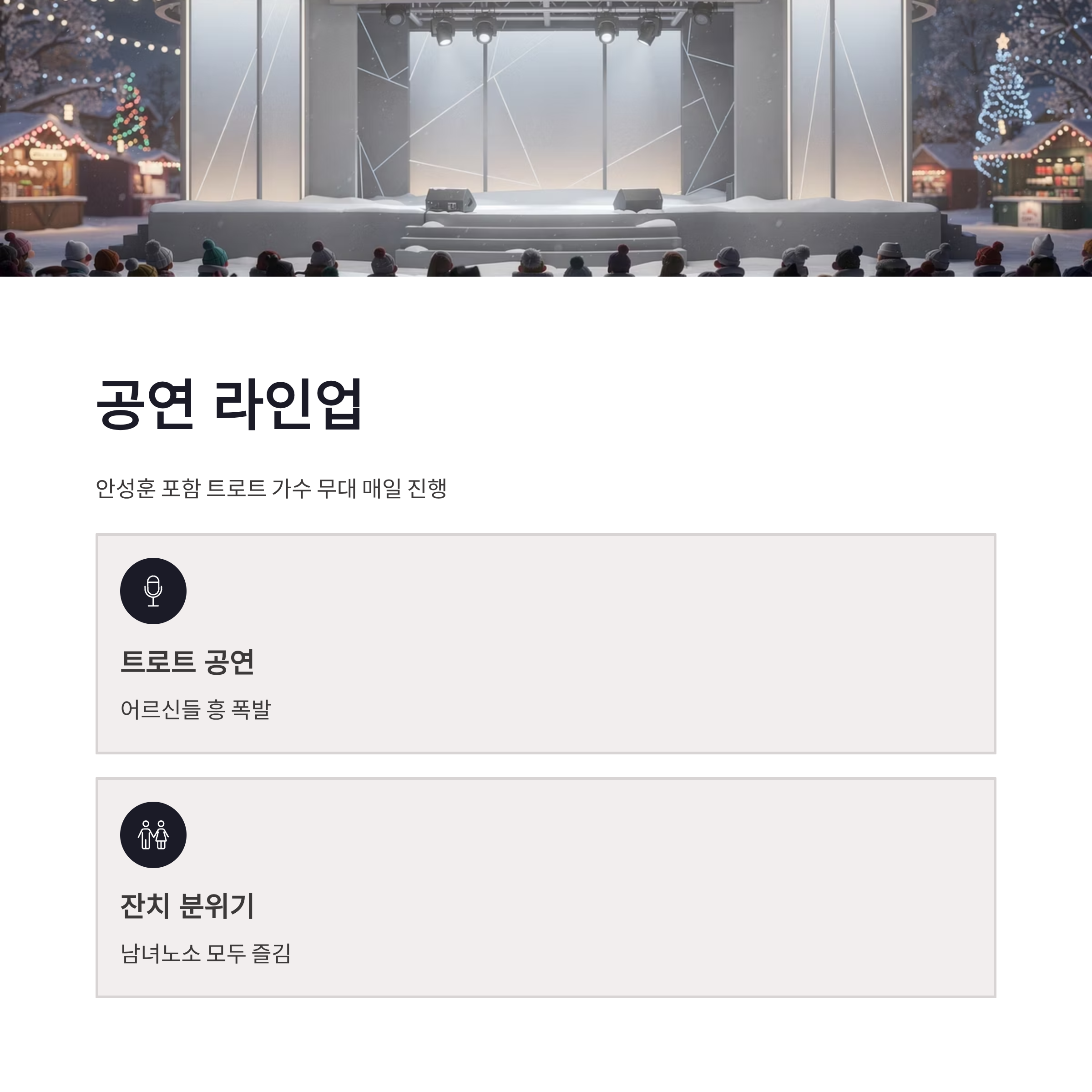 이번 지리산 산청 곶감축제에서 은근 놀랐던 게 공연 라인업이에요. 안성훈을 포함한 트로트 가수 무대가 매일 이어졌는데, 분위기가 완전 잔치였어요. 어르신들 흥 폭발ㅋㅋ 요즘은 지역 축제도 그냥 판매만 하는 게 아니라 공연+체험형으로 가는 게 트렌드라더니 딱 그 느낌. 장점은 남녀노소 다 즐김, 단점은 주말엔 살짝 붐빔… 그래도 겨울 축제치곤 동선은 괜찮았어요.