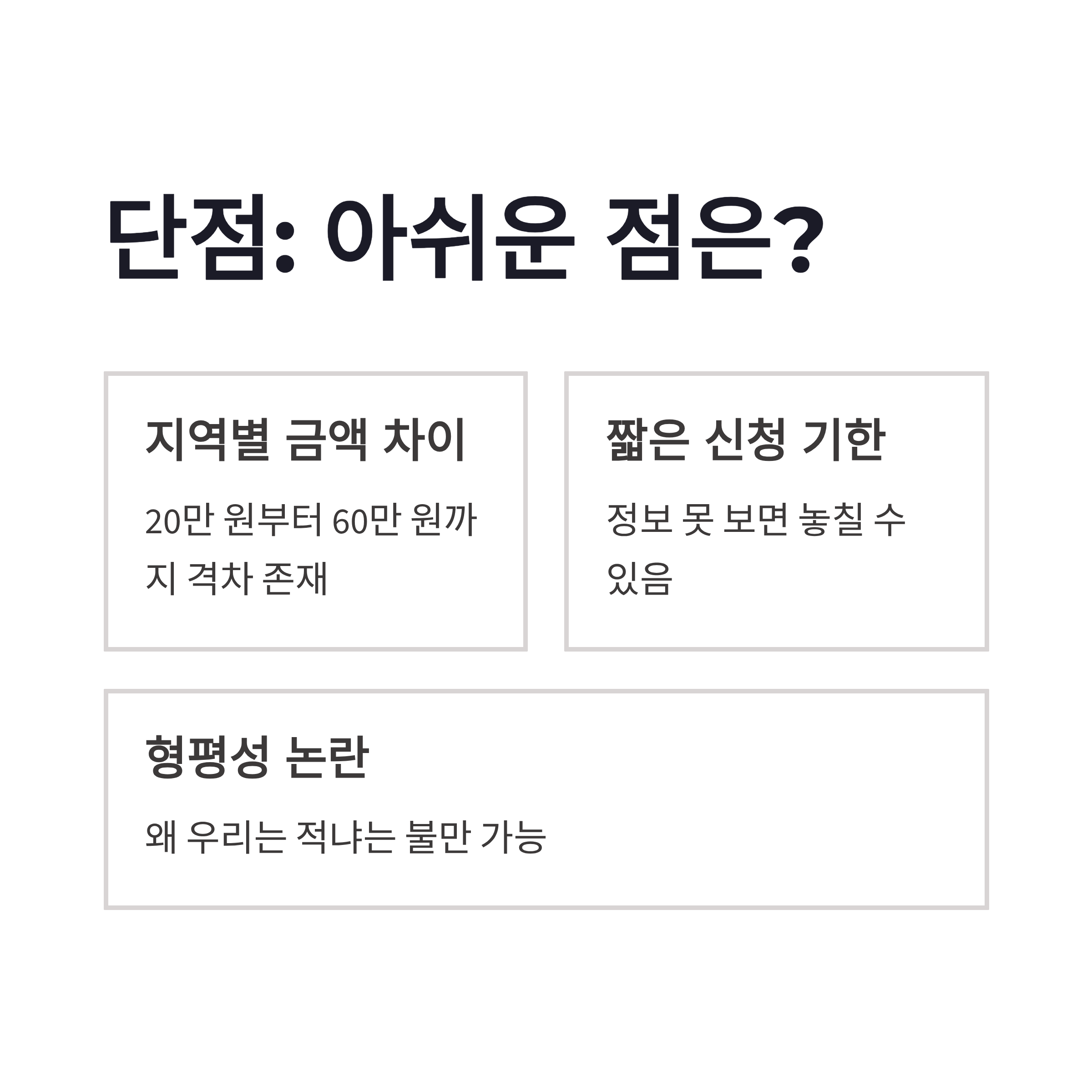 장점부터 말하면, 확실히 전 군민 지급이라 절차가 단순합니다. 소득 증빙, 조건 확인 이런 거 거의 없어서 부모님 세대도 신청하기 편하겠다 싶었구요. 지역화폐로 나오는 경우가 많아서 동네 상권에 바로 돈이 도는 구조라는 점도 장점입니다. 반면 단점도 있긴 해요. 지역마다 금액 차이가 크다 보니 “왜 우리는 적냐”는 말이 나올 수밖에 없고, 신청 기한 짧은 곳은 정보 못 본 분들은 그냥 지나칠 수도 있겠더라구요. 그래도 전체적으로 보면 이번 지자체별 민생지원금은 단기 체감 효과는 확실한 편이라고 느꼈습니다.