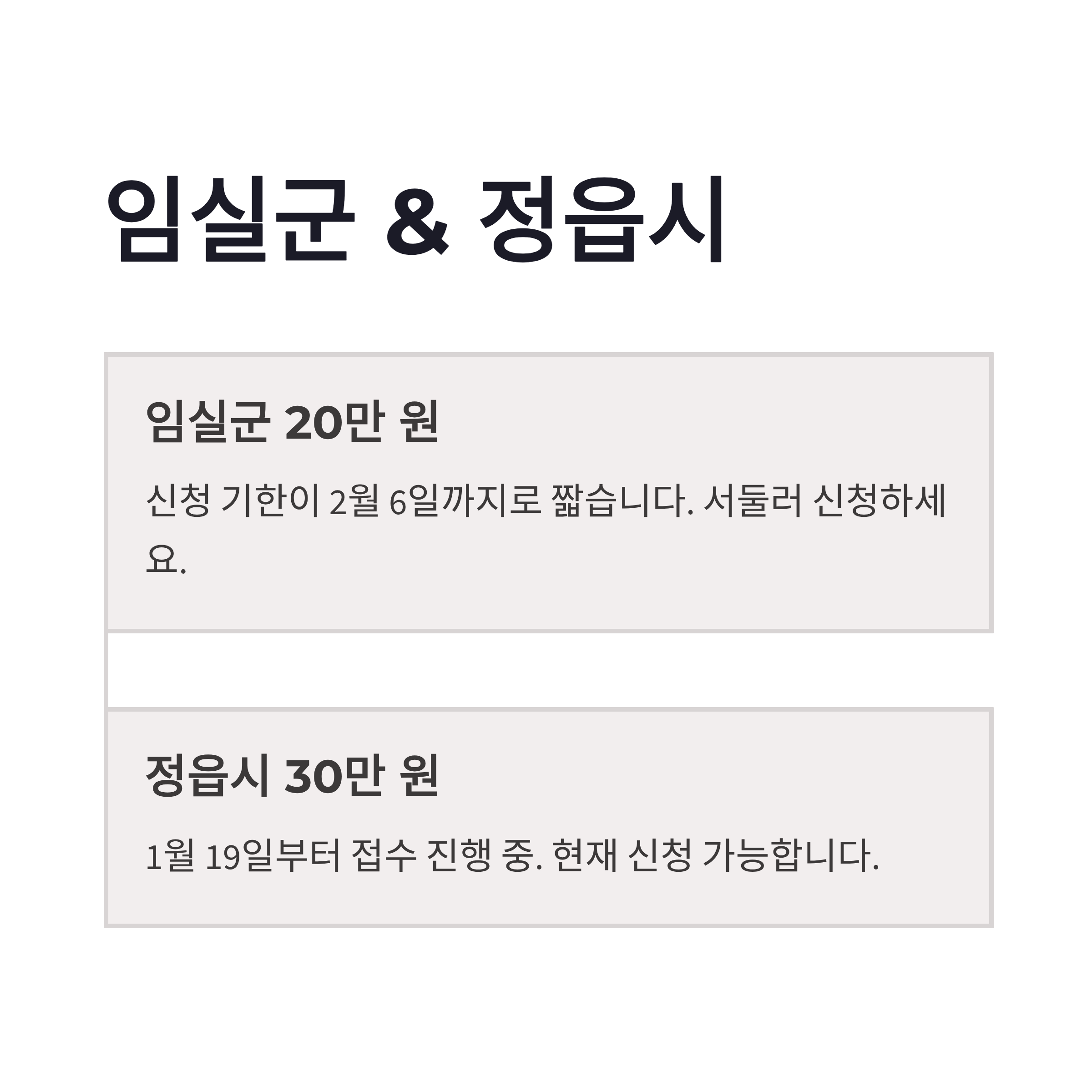 | 정읍시 | 1인당 30만 원 | 1월 19일부터 | 접수 진행 중 |