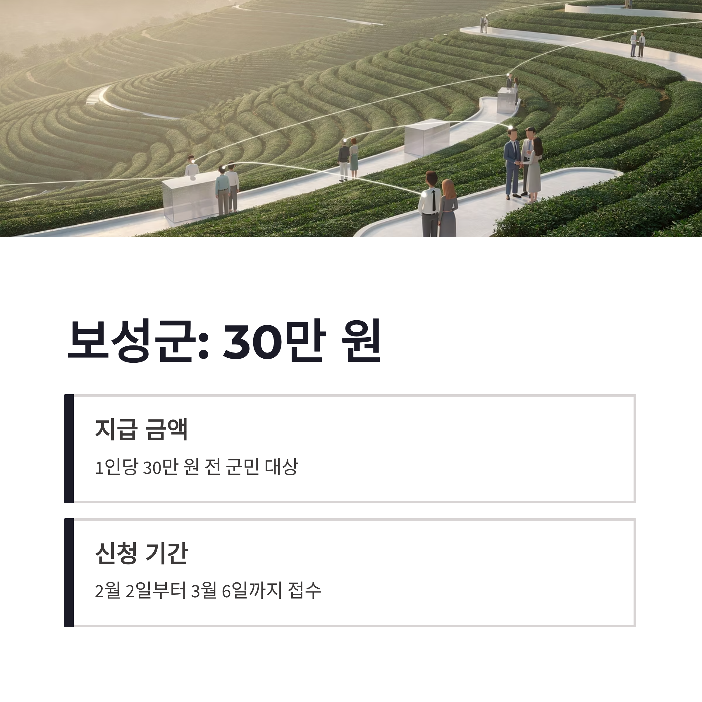 | 보성군 | 1인당 30만 원 | 2월 2일 ~ 3월 6일 | 전 군민 대상 |