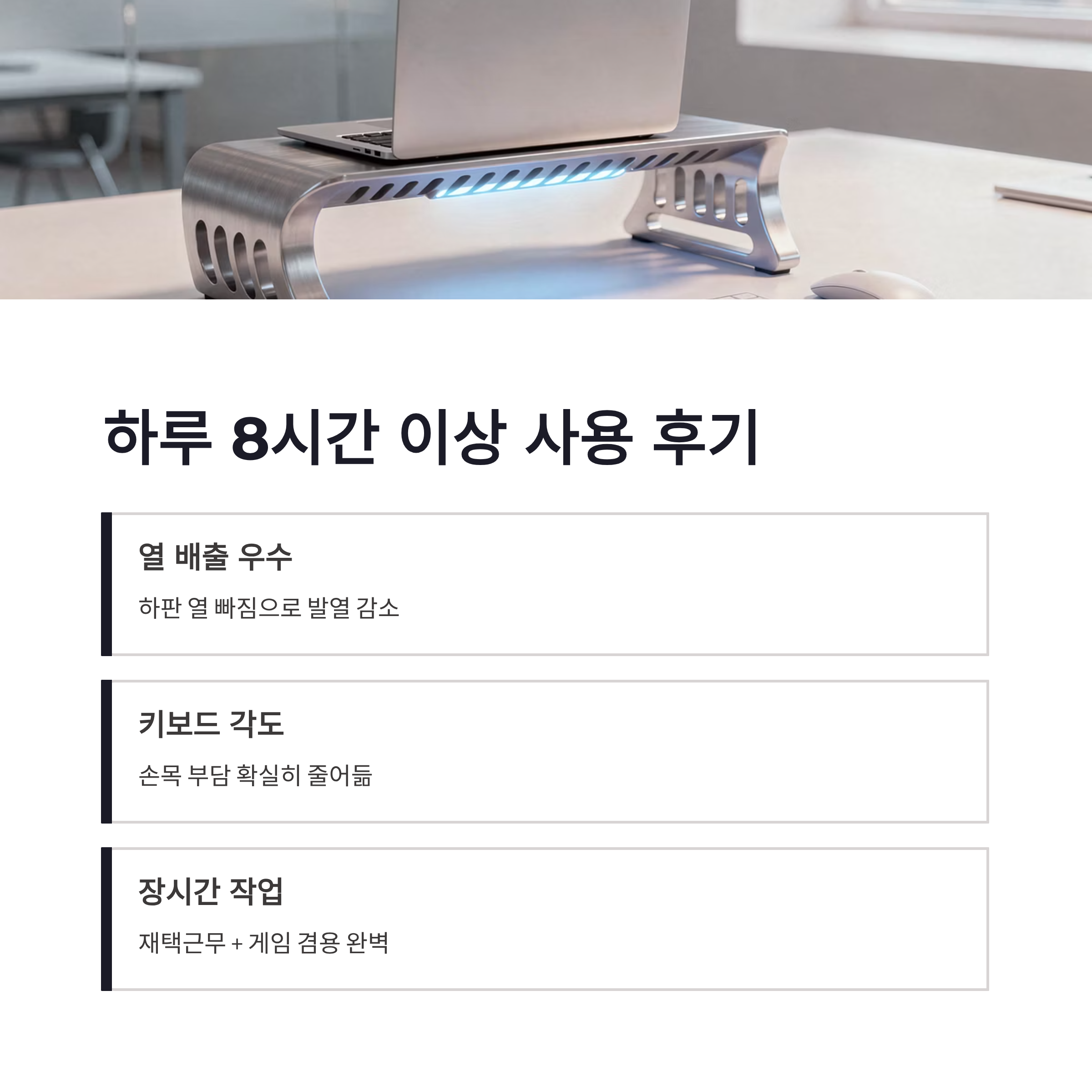 저는 재택근무 + 게임 겸용으로 하루 평균 8시간 이상 쓰는데요, 이럴 때 거치대 차이가 크게 느껴졌어요. 열 배출도 잘 되고 키보드 각도도 손목에 부담이 덜 가더라구요. 무엇보다 무게 중심이 좋아서 타이핑할 때 덜컹거림이 없었어요. 크리에이트 알루미늄 노트북 거치대 T3가 괜히 고정형으로 나온 게 아니더라구요.