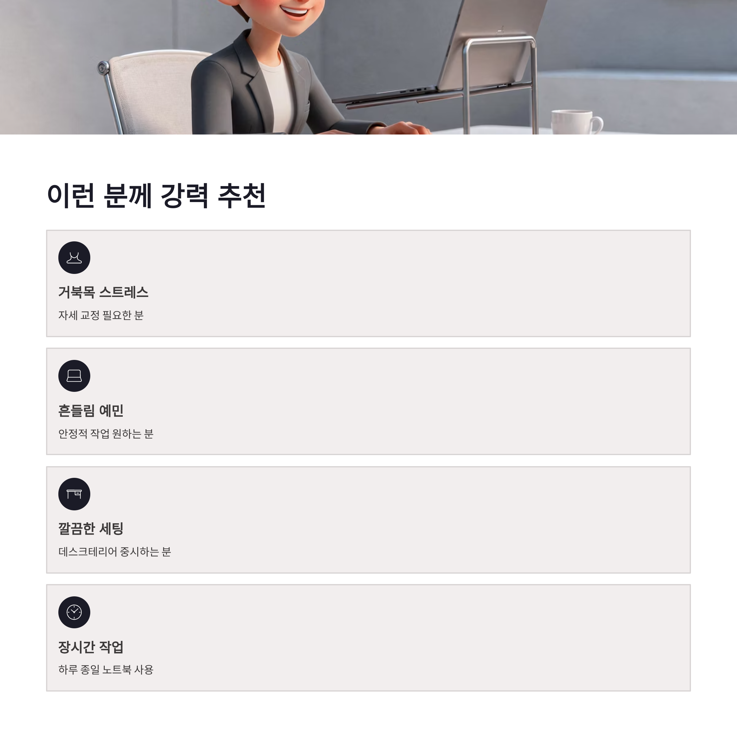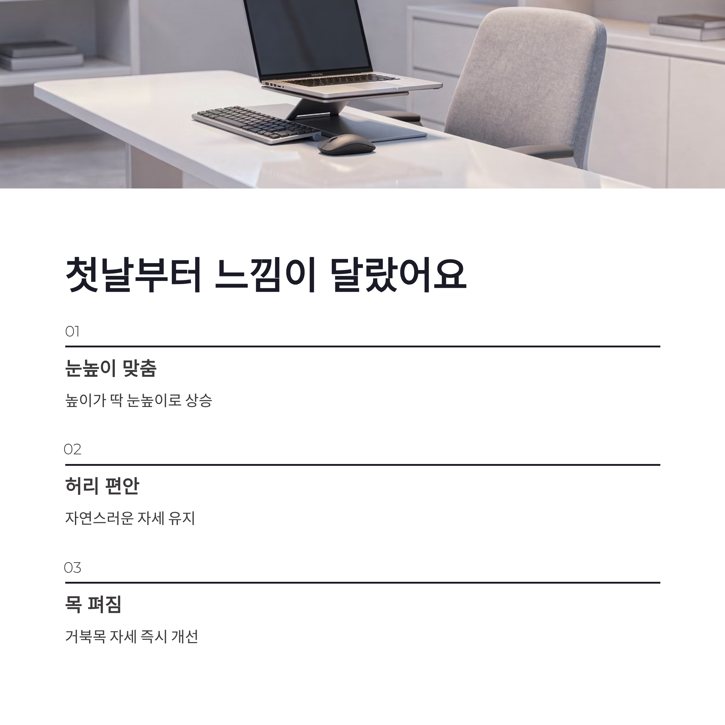 | 자세 | 확실히 개선 | 거북목 완화 체감 |