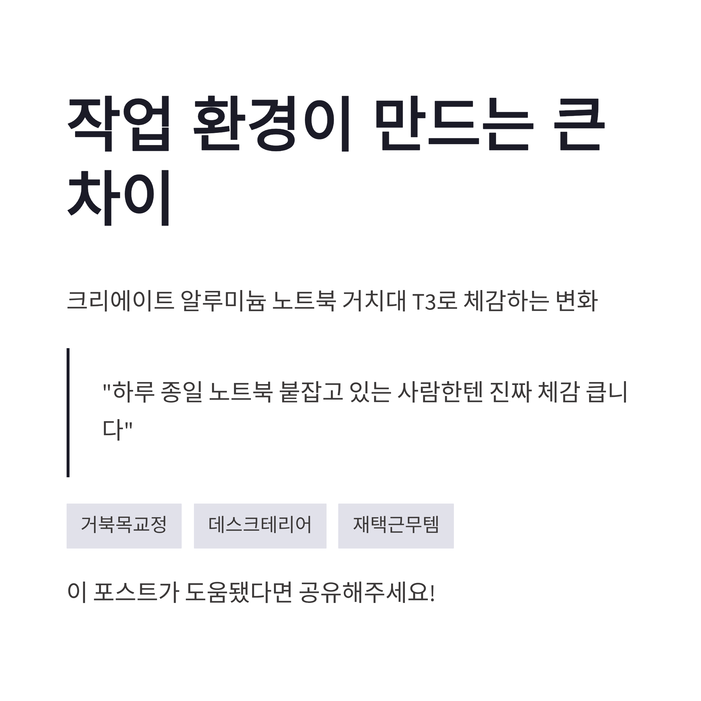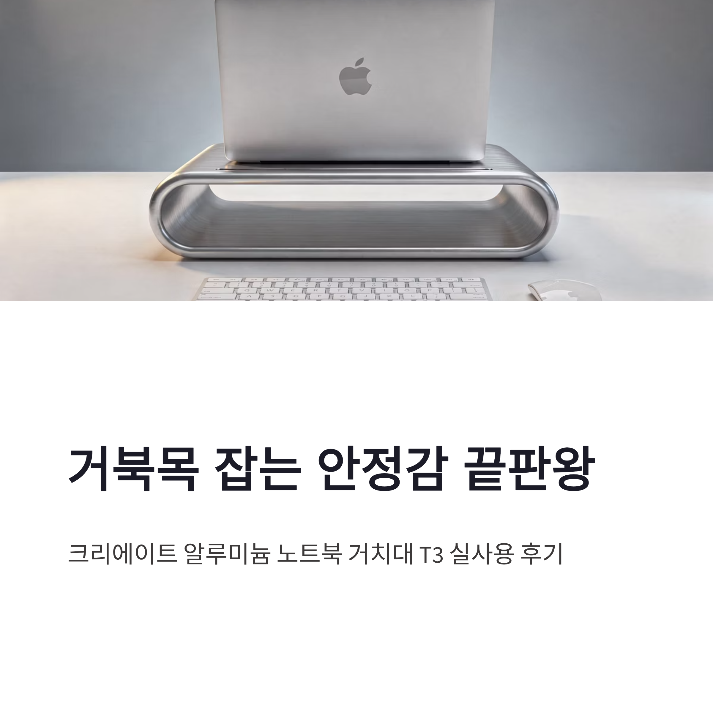 거북목 때문에 스트레스 받는 분, 노트북 흔들림에 예민한 분, 책상 세팅 깔끔하게 하고 싶은 분이라면 크리에이트 알루미늄 노트북 거치대 T3 만족도 높을 거예요. 저처럼 하루 종일 노트북 붙잡고 있는 사람한텐 진짜 체감 큽니다. 작업 환경 바꾸는 게 이렇게 큰 차이를 만들 줄은 몰랐네요 ㅎㅎ